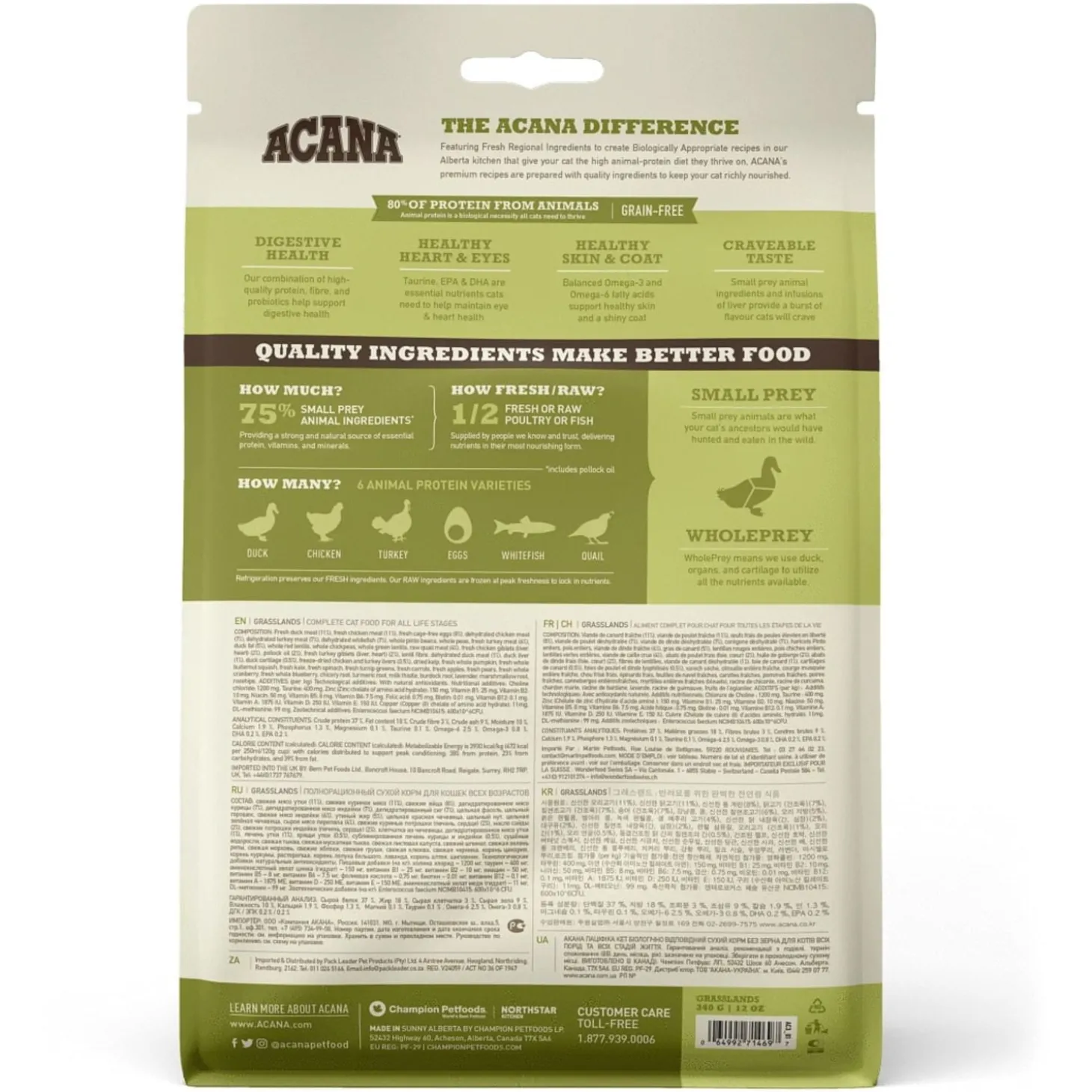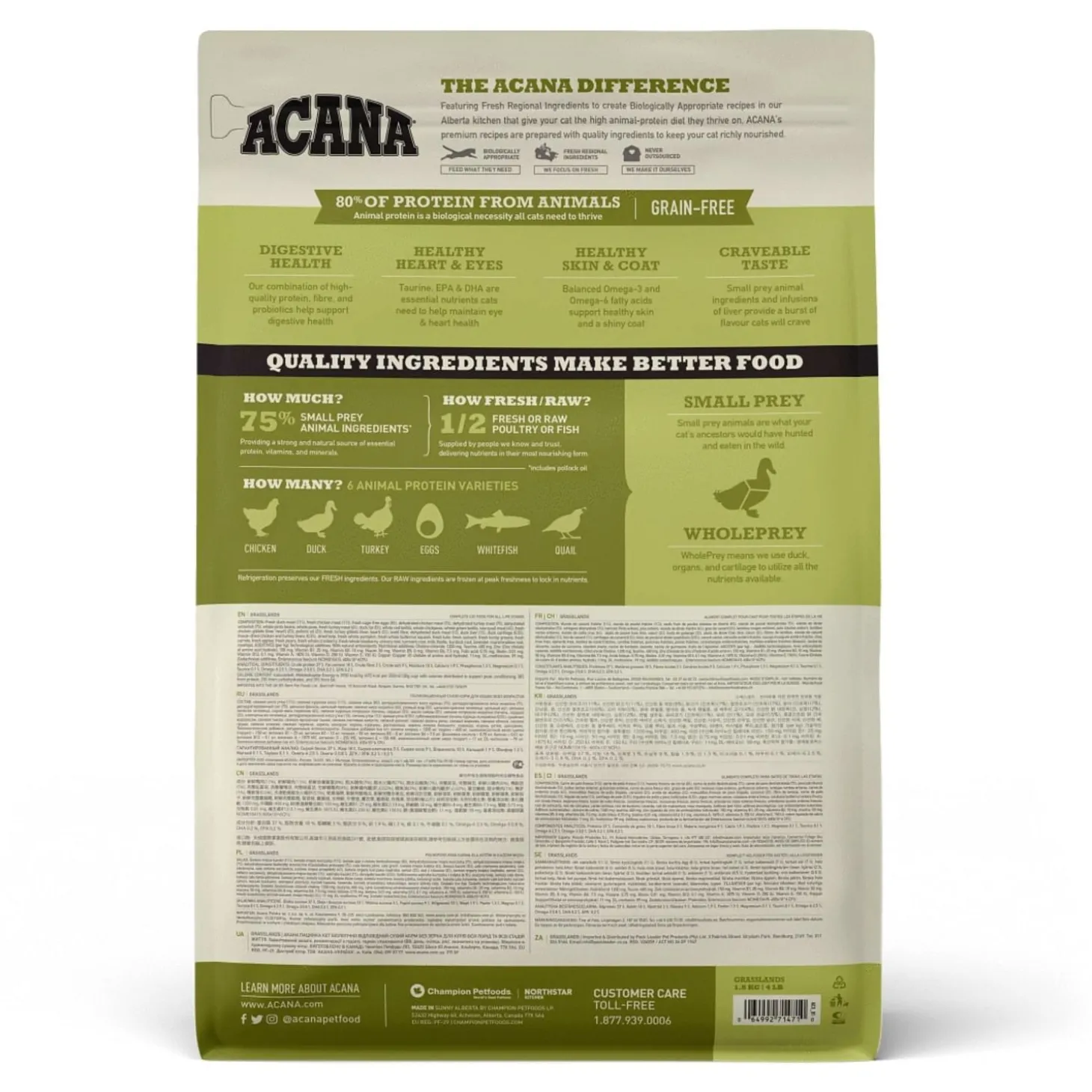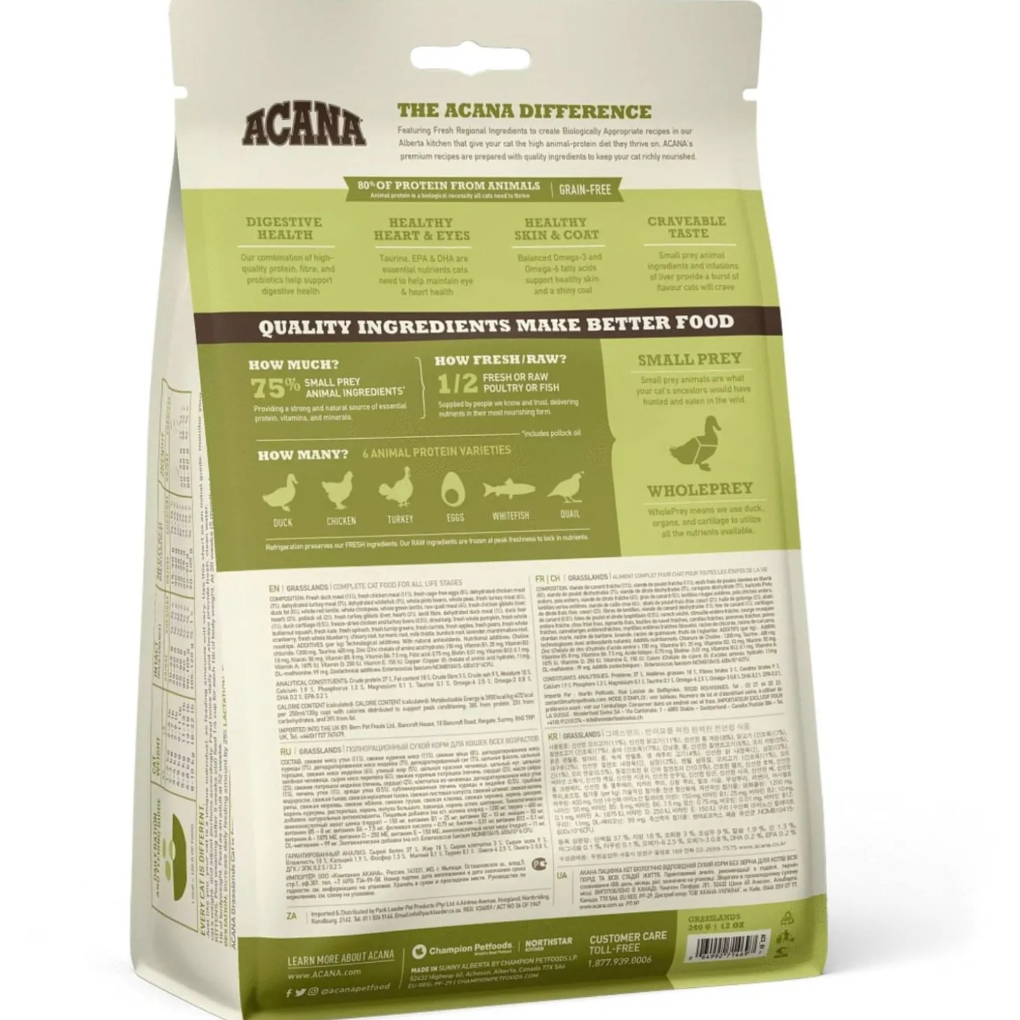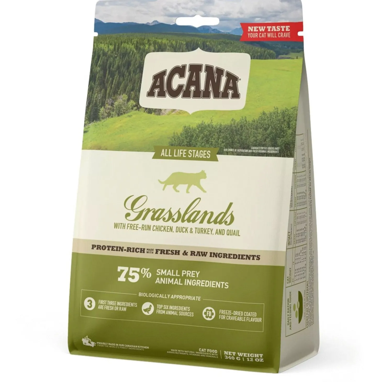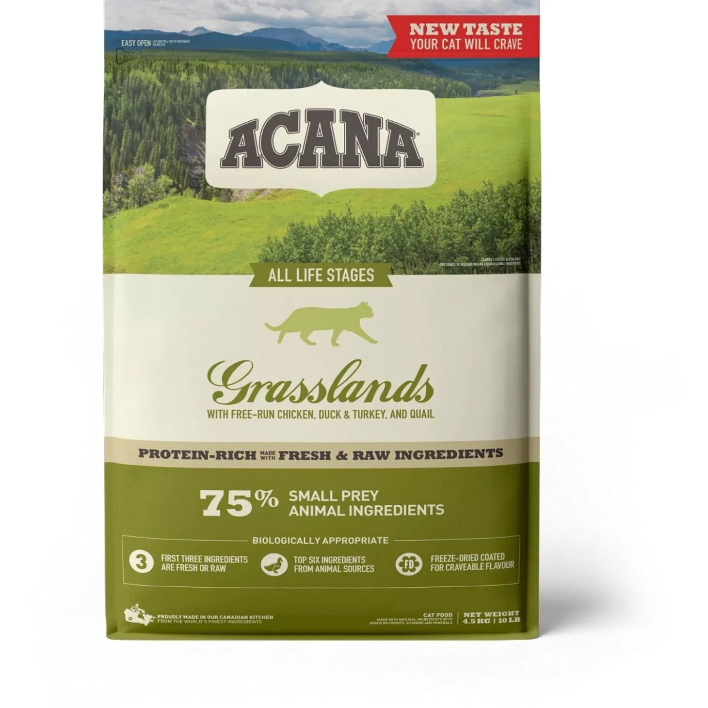 Jij wilt natuurlijk het beste voor je kat en zij hebben een eiwitrijk dieet nodig. Grasslands van Acana zit vol met vrijlopende kip, kalkoen en eend, kooivrije eieren en in het wild gevangen vis.