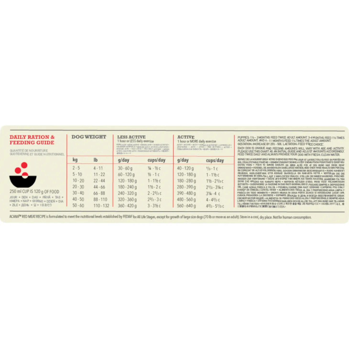 | Aanbeveling | ACANA heeft de juiste voeding voor iedere hond en kat. Net als jij is jouw huisdier uniek met voedingsbehoeften die variëren met de omgeving, leeftijd en activiteit. Het voedingsadvies op de verpakking biedt een startpunt, dat indien nodig kan worden aangepast om een optimaal gewicht en een optimale conditie te behouden. We raden aan om het gewicht van je dier in de gaten te houden en het rantsoen indien nodig aan te passen. We raden aan om tweemaal per dag te voeren en altijd vers, schoon water beschikbaar te houden. Om de versheid te behouden, raden we aan de voeding in de verpakking te bewaren, deze goed af te sluiten en op een koele, droge plaats te bewaren. |