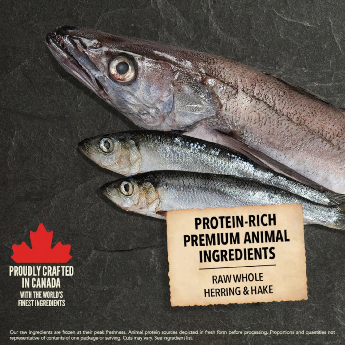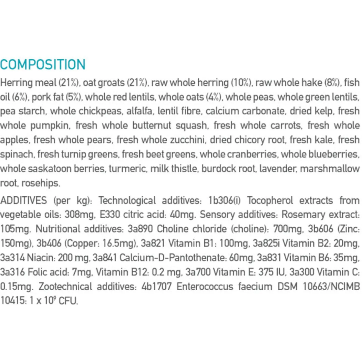 | Samenstelling | Rauwe zalm (22 %), gedroogde haring (19 %), parelgort, hele erwten, havergrutten, varkensvet (8 %), hele haver, kikkererwtenvezel, visolie (1 %), calciumcarbonaat, kaliumchloride, gedroogde kelp, zout, gedroogde cichoreiwortel, verse hele pompoen, verse hele flespompoen, verse hele wortels, verse hele appels, verse hele peren, verse hele courgette, verse boerenkool, verse spinazie, verse raapstelen, vers bietenloof, hele veenbessen, hele bosbessen, hele Saskatoon-bessen, kurkuma, mariadistel, kliswortel, lavendel, heemstwortel, rozenbottels. |