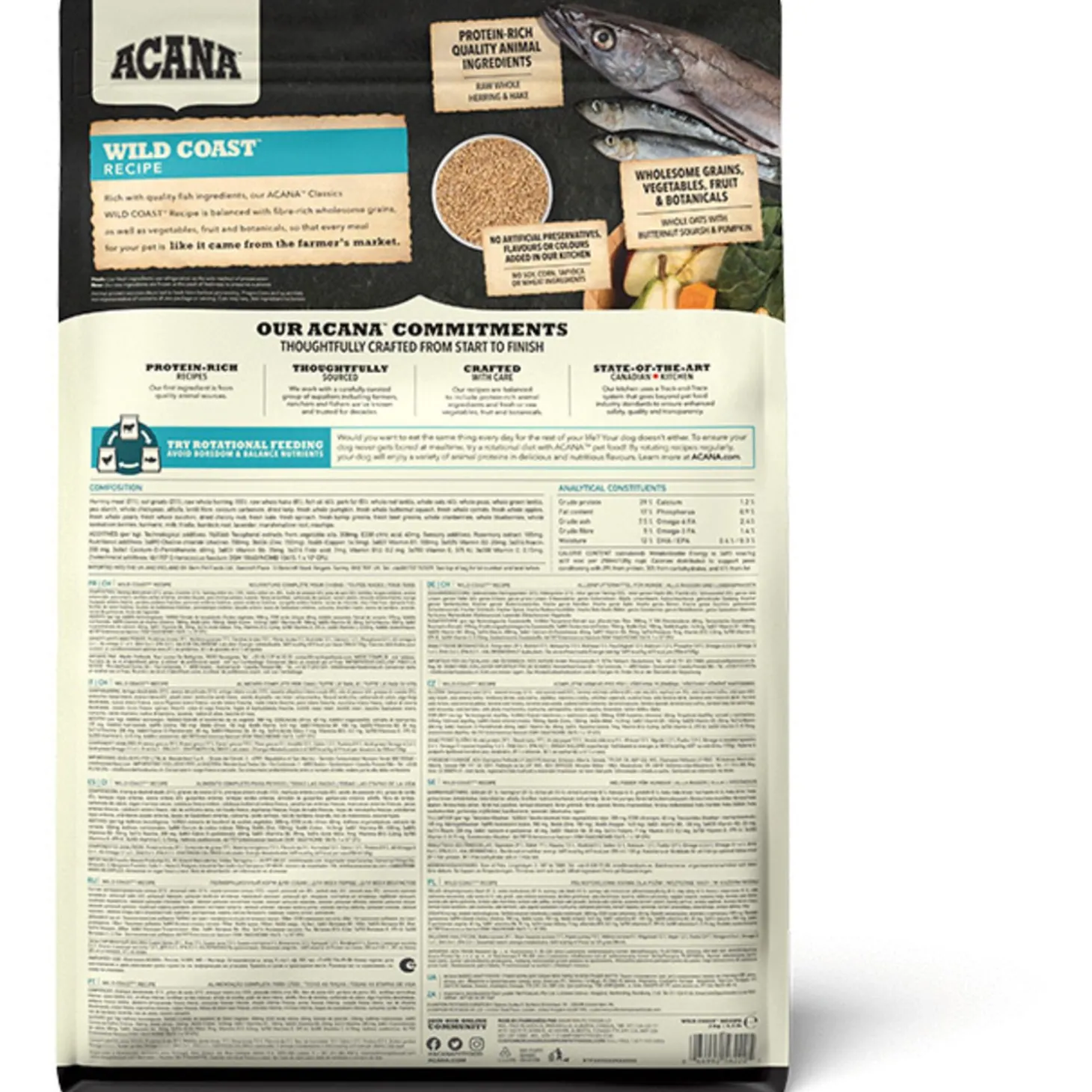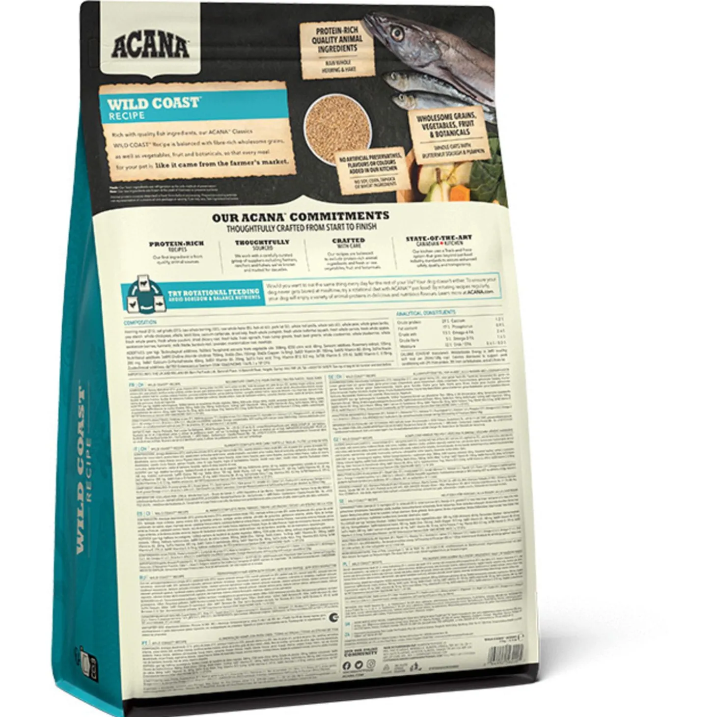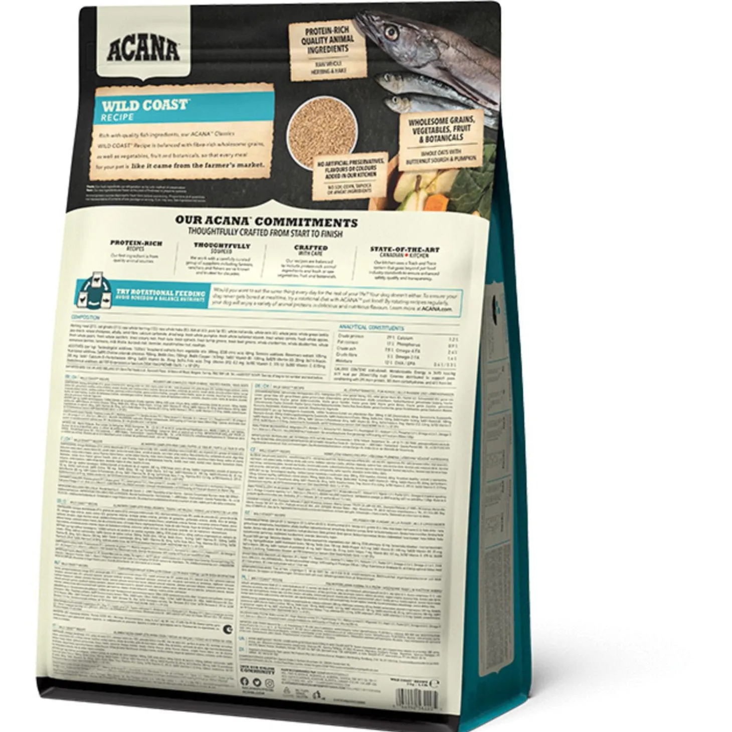 De voeding van ACANA is volgens het Biologically Appropriate-principe bereid en zit vol waardevolle voedingsstoffen voor een perfecte voeding van honden van alle rassen en leeftijden. ACANA Wild Coast bestaat uit 50% dierlijke ingrediënten en 50% plantaardige ingrediënten. Zij maken gebruik van glutenvrije haver voor een gelijkmatige energieafgifte.