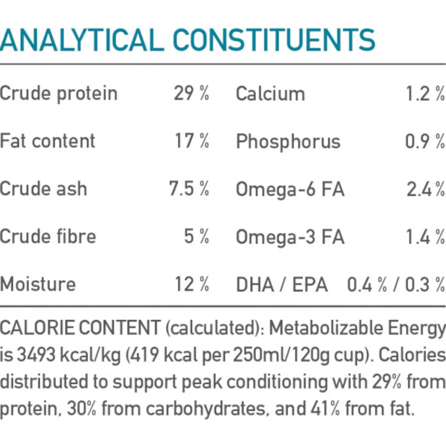 | Analyse | Ruw eiwit 29 %Ruw vet 17 %Ruwe as 7.5 %Ruwe celstof 5 %Vocht 12 %Calcium 1.1 %Fosfor 0.9 %Omega-6 vetzuren 2.4 %Omega-3 vetzuren 1.4 %DHA / EPA 0.4 % / 0.3 %Glucosamine 700 mg/kgChondroitine 900 mg/kg |