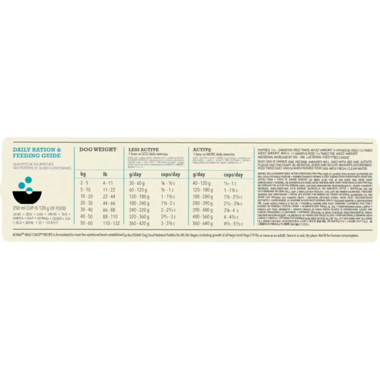 | Aanbeveling | ACANA heeft de juiste voeding voor iedere hond en kat. Net als jij is jouw huisdier uniek met voedingsbehoeften die variëren met de omgeving, leeftijd en activiteit. Het voedingsadvies op de verpakking biedt een startpunt, dat indien nodig kan worden aangepast om een optimaal gewicht en een optimale conditie te behouden. We raden aan om het gewicht van je dier in de gaten te houden en het rantsoen indien nodig aan te passen. We raden aan om tweemaal per dag te voeren en altijd vers, schoon water beschikbaar te houden. Om de versheid te behouden, raden we aan de voeding in de verpakking te bewaren, deze goed af te sluiten en op een koele, droge plaats te bewaren. |
