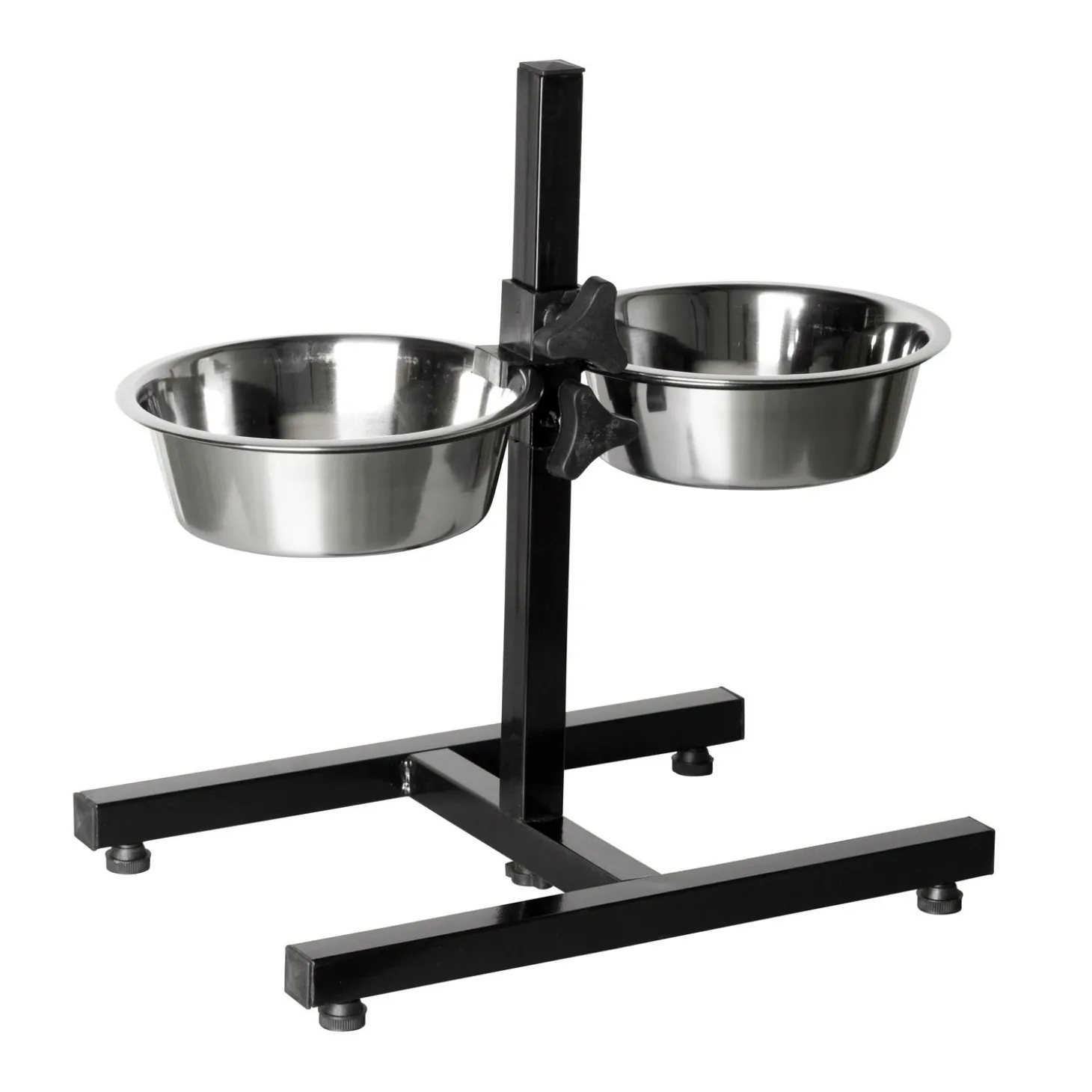 Met een H-model voerstandaard maak je het leven van jou en je hond een stukje makkelijker. Zo voorkom je met een voerstandaard viezigheid en krassen op je vloer. Het zware metalen standaard is in hoogte verstelbaar en bevat twee RVS-bakken (vaatwasserbestendig). De extra klem zorgt ervoor dat de bakken goed op hun plaats blijven staan. De voerbak is beschikbaar in drie verschillende maten (diameter van de RVS bakken):