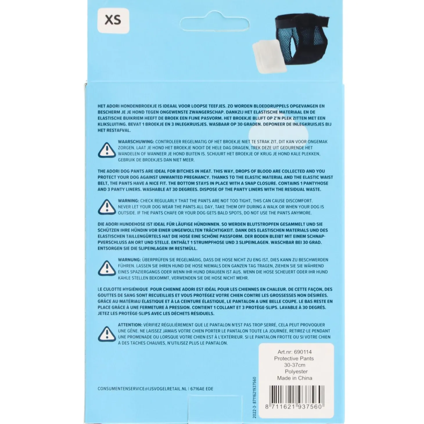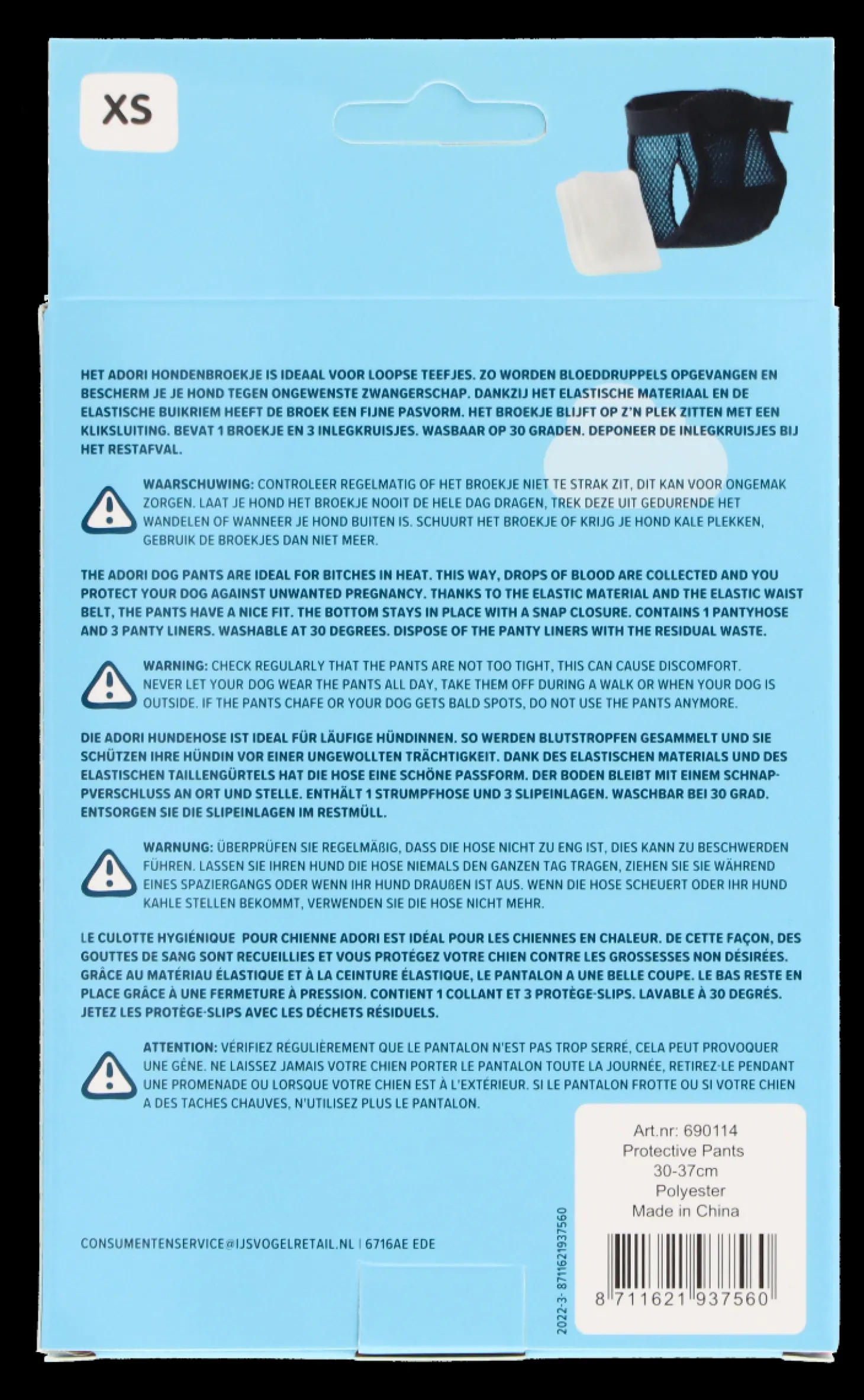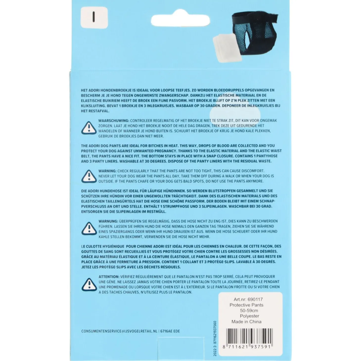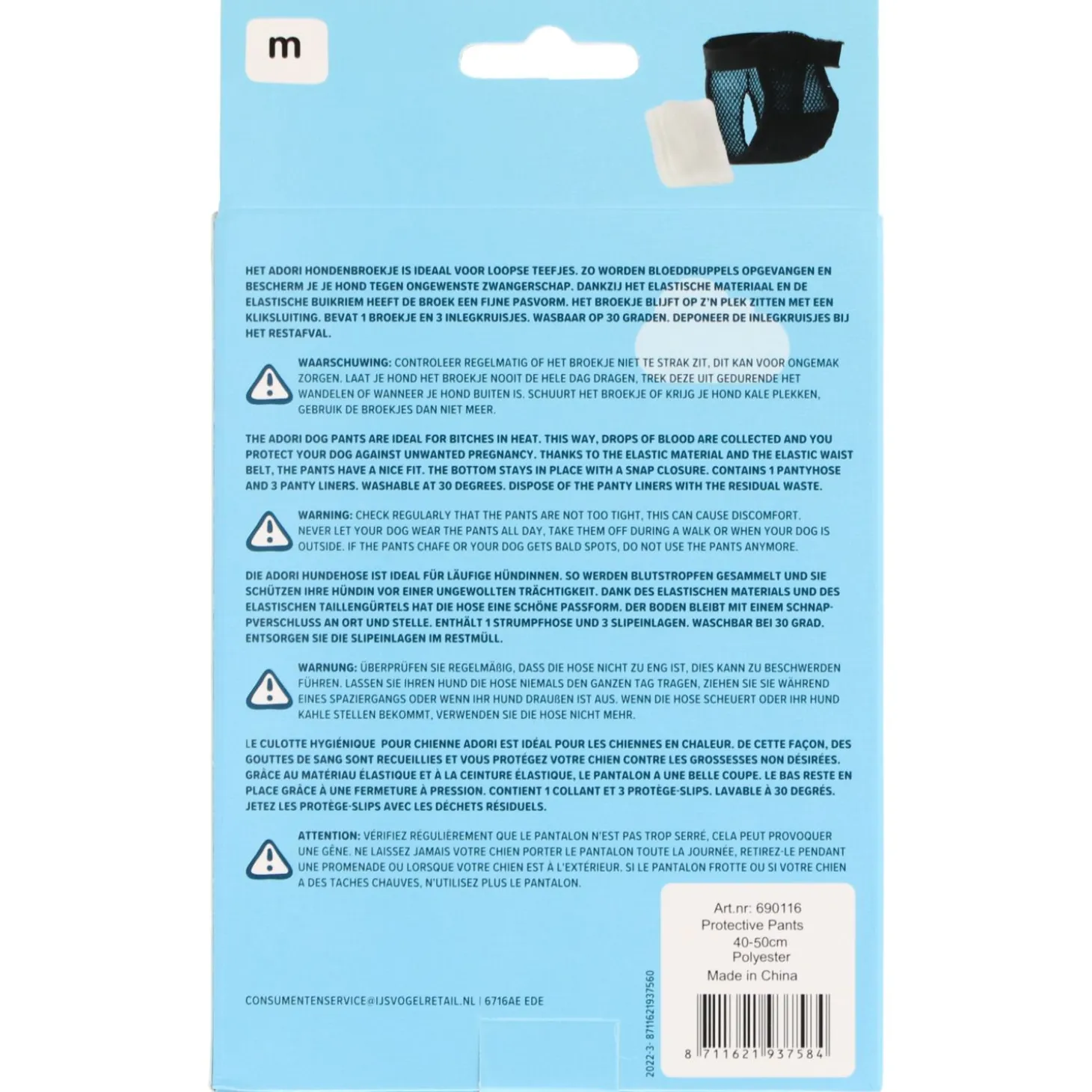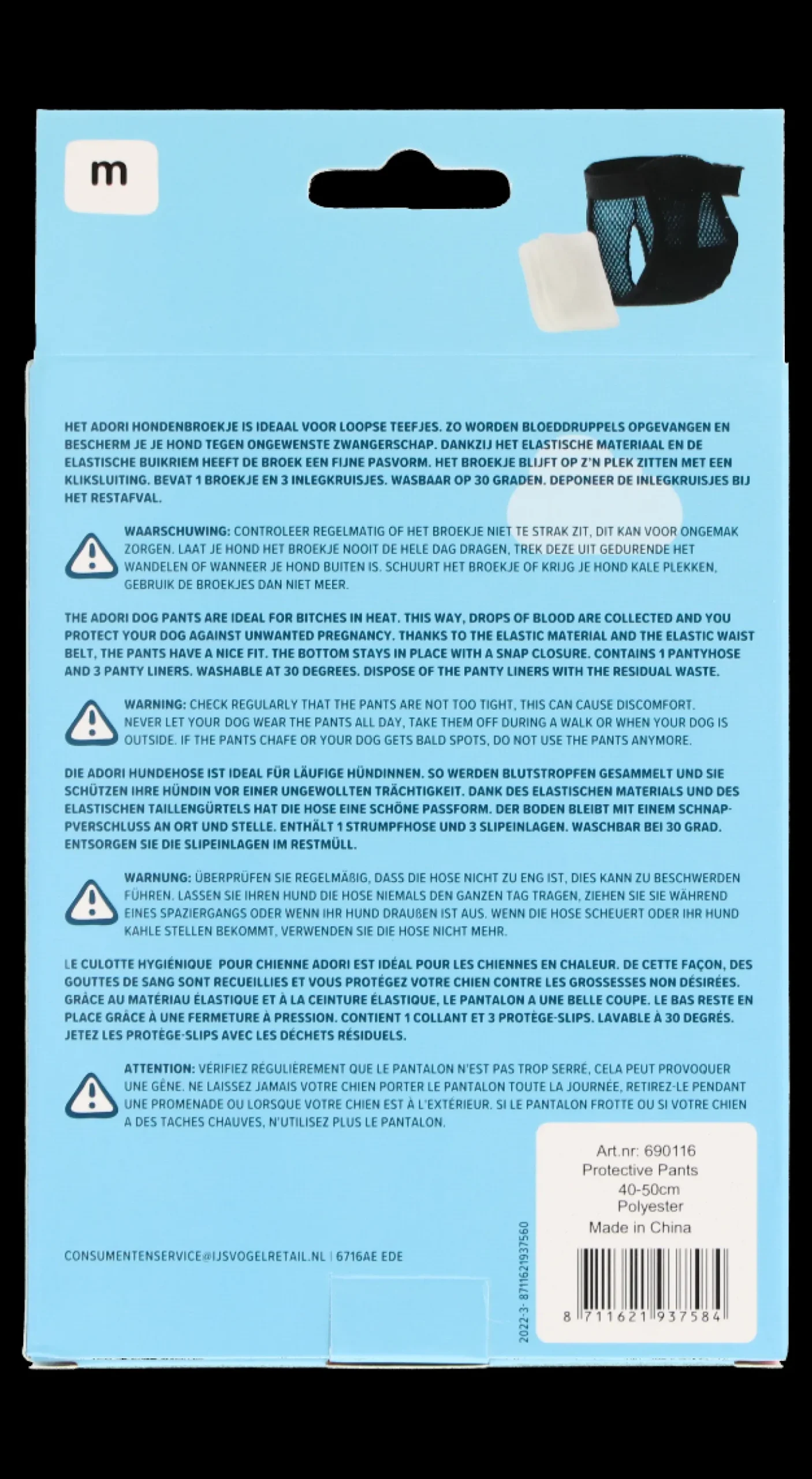 Het Hondenbroekje is zwart van kleur en is wasbaar op 30 graden. Het broekje is beschikbaar in zes verschillende maten, waarbij uit wordt gegaan van de omtrek van de buik: