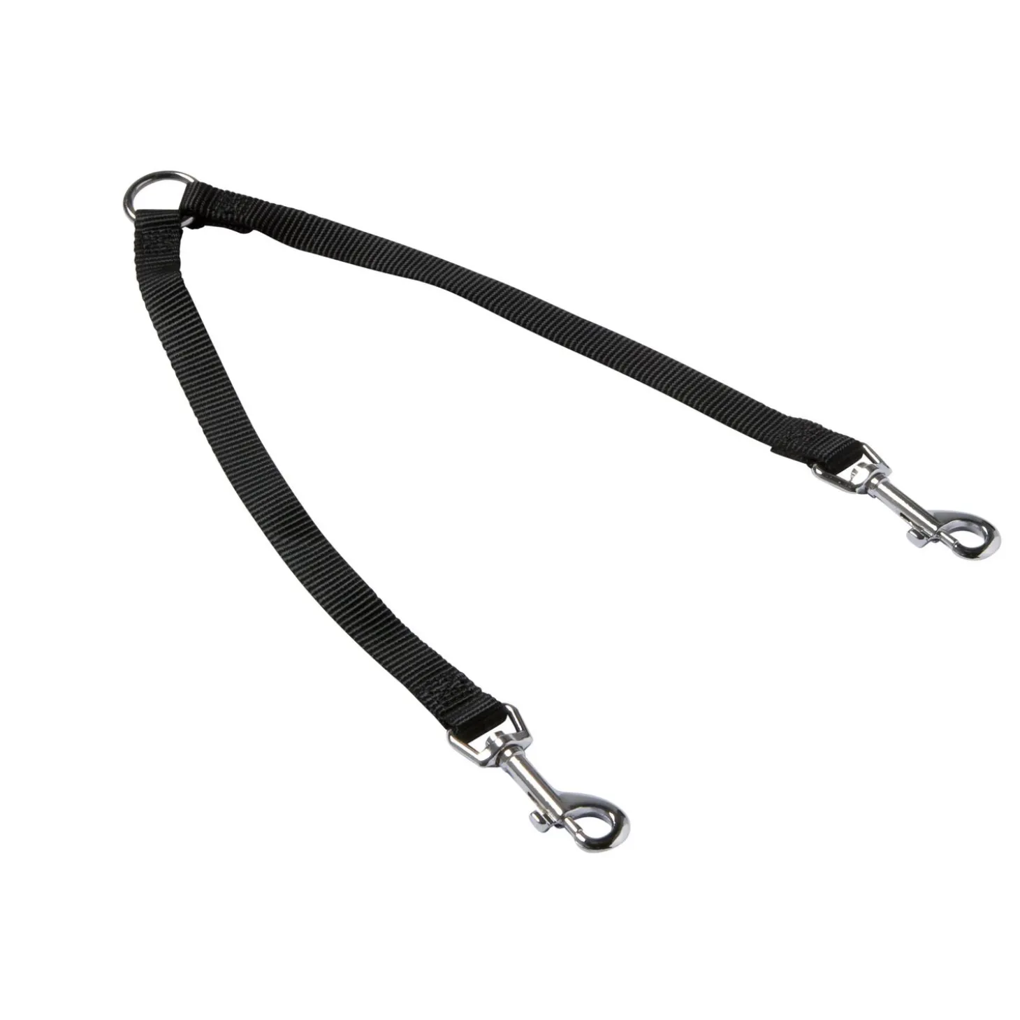Met het Koppelstel Nylon laat je eenvoudig twee honden uit aan één lijn. Koppel bovenaan je favoriete riem vast aan het koppelstuk en aan de twee uiteindes kan je de halsbanden of tuigen van je honden vastmaken. Het koppelstuk is zwart van kleur en is beschikbaar in twee maten: 28 x 42 cm en 33 x 50 cm.