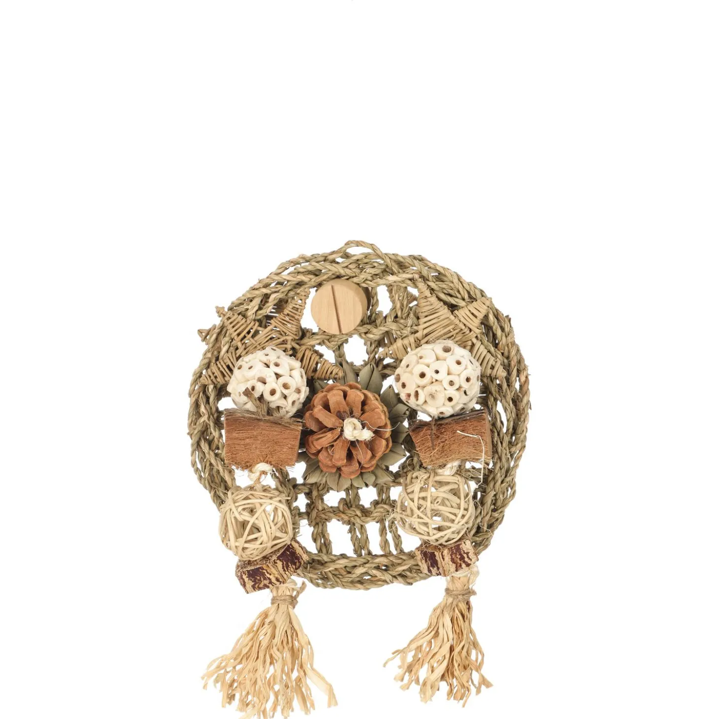 De Adori Natural Play Mat is een uniek vogelspeeltje in matvorm, gemaakt van stevig gevlochten zeegras waarin verschillende natuurlijke elementen zijn verwerkt. Deze ronde speelmat bevat sola ballen, houten schijfjes, dennenappels, gevlochten balletjes en andere natuurlijke schatten die je vogel kan ontdekken. De decoratieve raffia kwastjes aan de onderzijde nodigen uit tot trekken en plukken. Dit speelgoed kan aan de kooi worden bevestigd en vormt zo een verticale speelwand waar je vogel op kan klimmen, aan kan knagen en mee kan spelen.