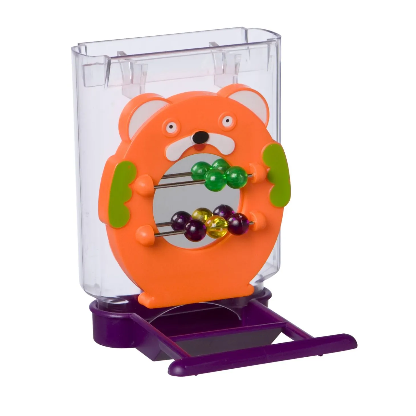 | Samenstelling | Spiegel met telraam, zitstok en voerbakje. |
