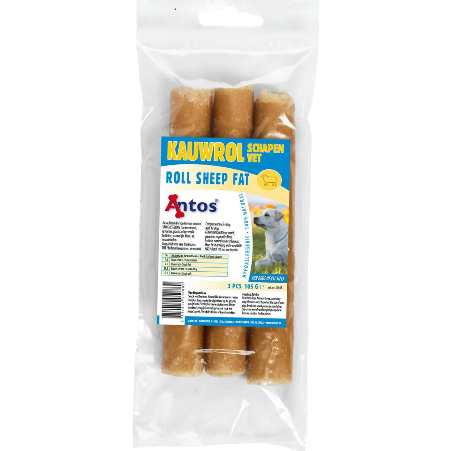 | Samenstelling | Tarwezetmeel, glycerine, plantaardige vezels, lecithine, natuurlijke kleur- en smaakstoffen |