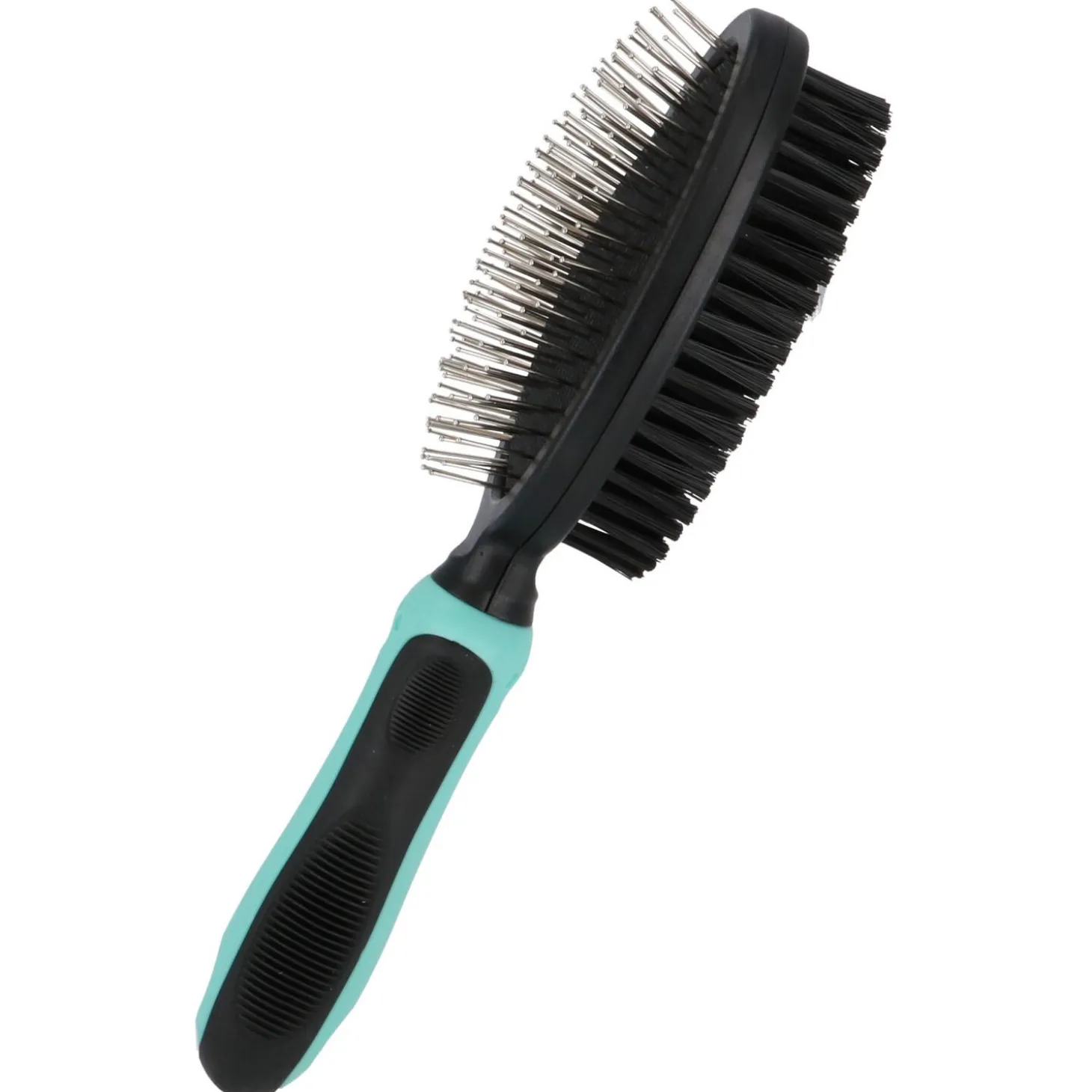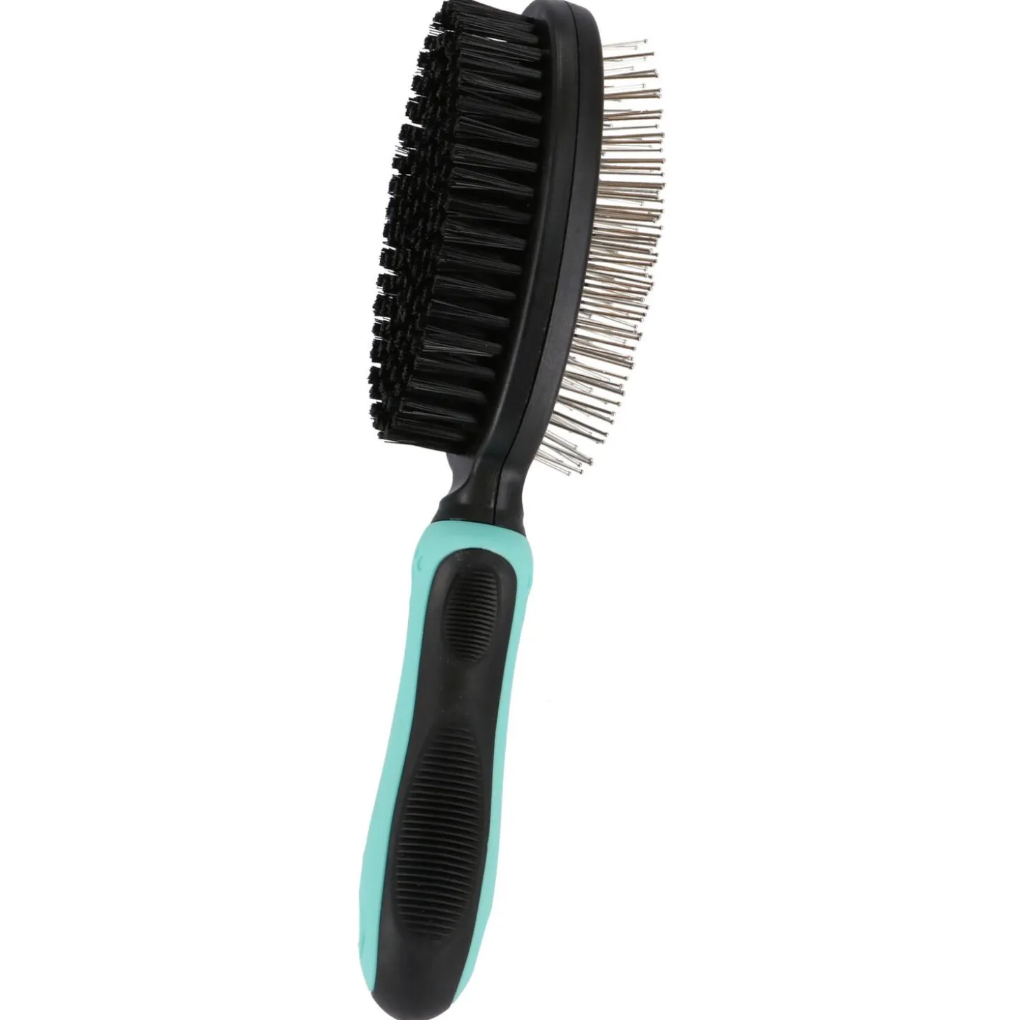 Deze praktische dubbelzijdige borstel biedt de complete oplossing voor dagelijkse vachtverzorging. De pinzijde, voorzien van veilige plastic doppen, zorgt voor het voorzichtig ontwarren en verwijderen van losse haren, terwijl de zachte nylonzijde de vacht glad maakt en laat glanzen. Het ergonomische ontwerp maakt de borstel prettig in gebruik, waardoor de dagelijkse verzorging een ontspannen moment wordt voor jou en je hond.