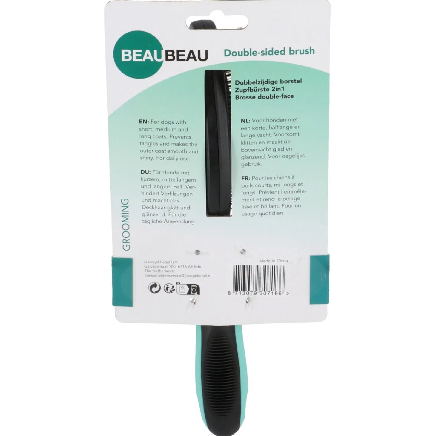 Deze veelzijdige borstel verenigt alle essentiële borstelfuncties in één handig product. De combinatie van ontwarrende pinnen en zachte nylonharen zorgt voor een complete vachtverzorging, van het verwijderen van klitten tot het creëren van een stralende finish. Perfect voor alle vachttypen en specifiek ontwikkeld voor effectieve maar zachte verzorging. Geef je hond de verzorging die hij verdient en bestel nu de BeauBeau Dubbelzijdige Borstel!