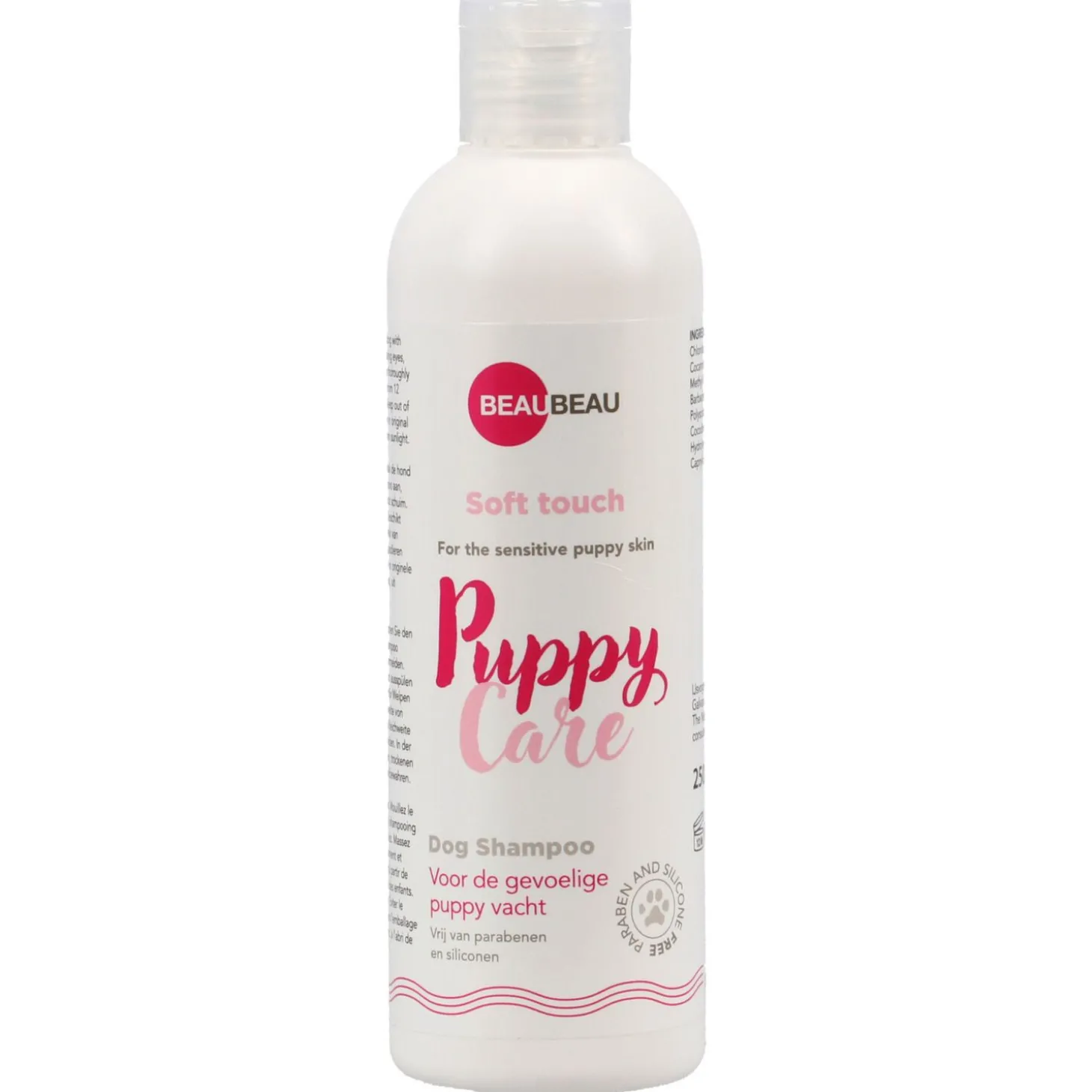 De eerste verzorgingservaringen zijn belangrijk voor je puppy’s ontwikkeling. Deze zachtaardige shampoo is speciaal samengesteld om je puppy vanaf 12 weken oud veilig en comfortabel te reinigen. De formule zonder parabenen en siliconen zorgt voor een grondige maar milde reiniging, terwijl de hydraterende ingrediënten de jonge huid en vacht optimaal verzorgen. Geef je puppy de beste start en begin direct met de juiste verzorging met BeauBeau Puppy Shampoo!