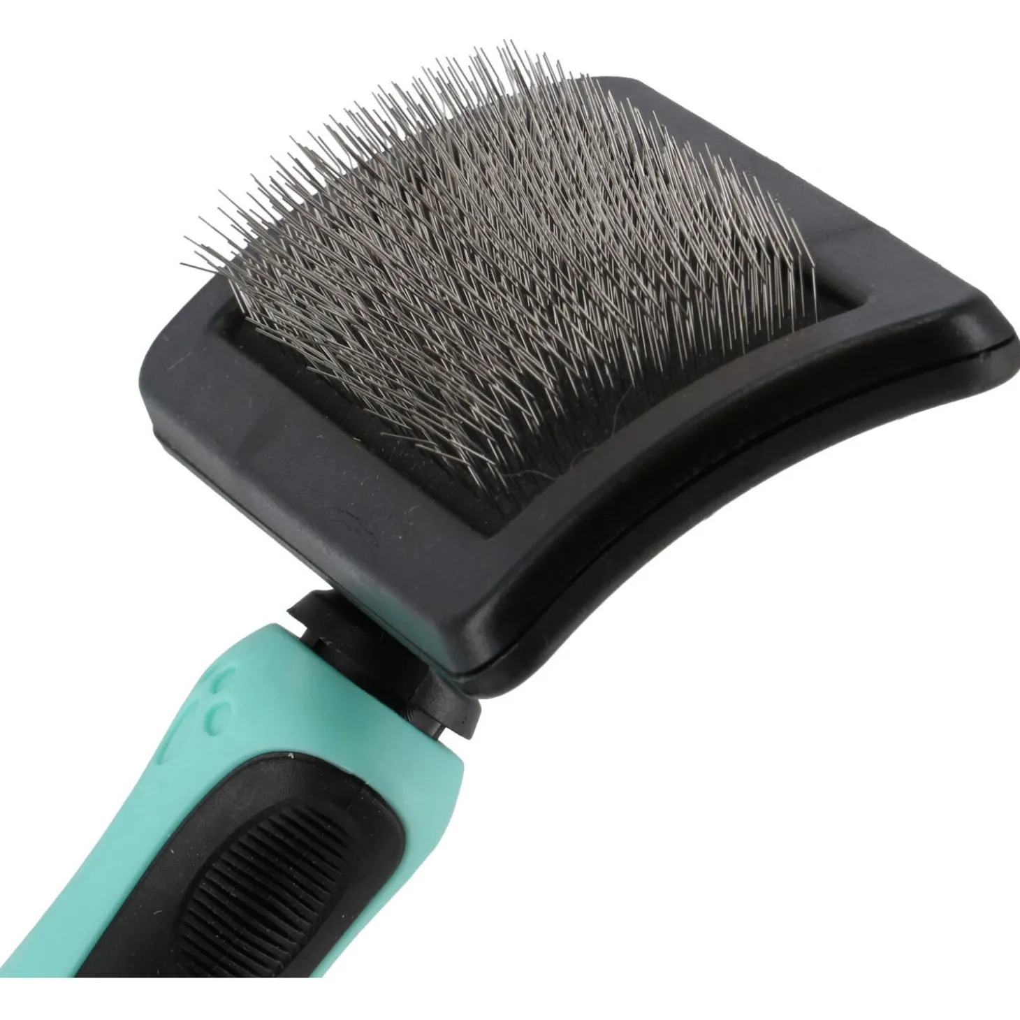 Deze professionele slickerborstel is een essentieel hulpmiddel voor eigenaren van middelgrote tot grote honden met een middellange, lange of krullende vacht. De speciaal ontworpen fijne, gebogen pinnen dringen diep door tot in de ondervacht, waar ze effectief klitten losmaken en overtollige onderwol verwijderen. Het ruime borstelvlak maakt het mogelijk om grotere gedeeltes van de vacht efficiënt te behandelen, wat aanzienlijke tijdsbesparing oplevert. Het ergonomische turquoise handvat zorgt voor een prettige grip en optimale controle tijdens het borstelen, zelfs bij intensief gebruik.