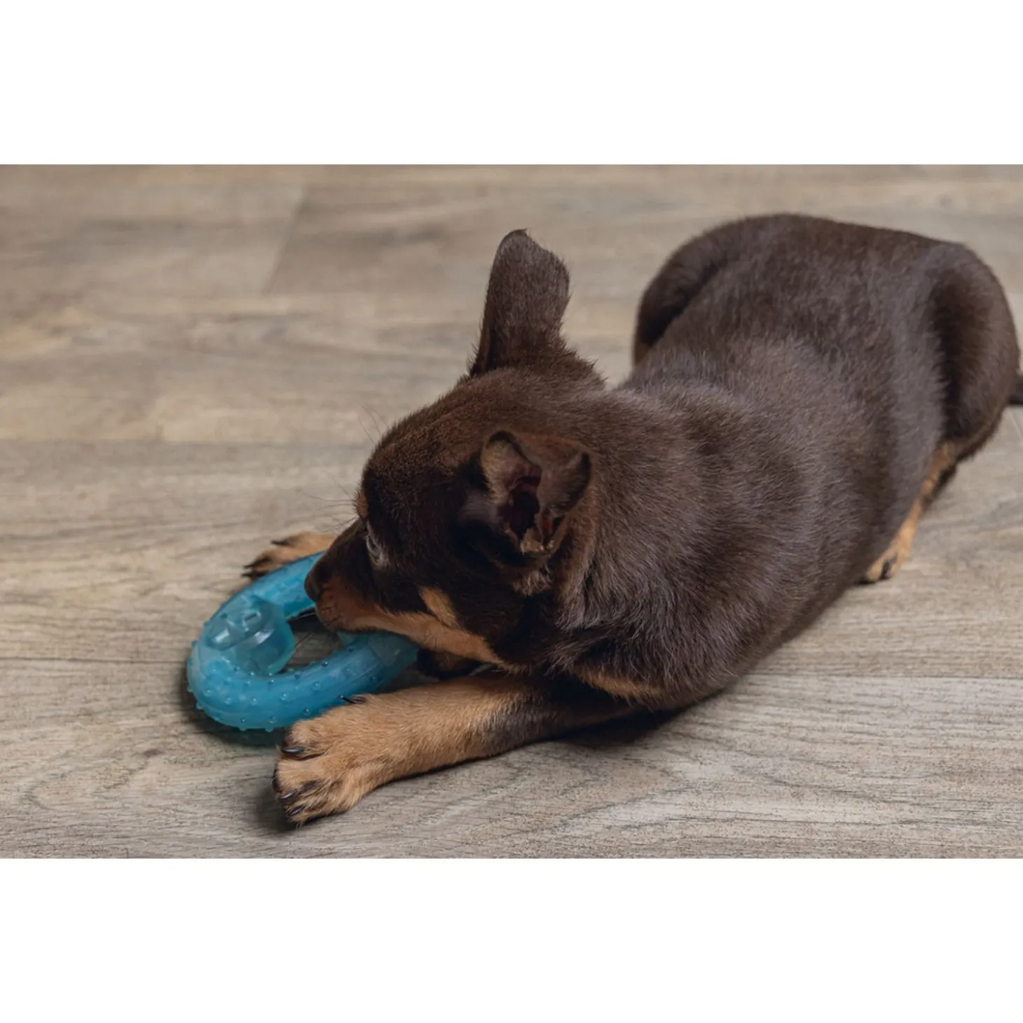 Dit leuke speelgoed in de vorm van een ring masseert het tandvlees van je puppy en het kauwen op het bot verzacht de pijn van doorkomende tanden. Je puppy kan naar hartenlust op de ring kauwen en bijten. Ook bijzonder aan deze ring, is dat je hem kan koelen in de vriezer. Zo geeft de ring verkoeling in de zomer en werkt het verzachtend bij pijn in de bek. Leg de ring ongeveer 25 minuten in de vriezer voor gebruik. Natuurlijk kan je de ring ook gewoon gebruiken om mee te spelen.