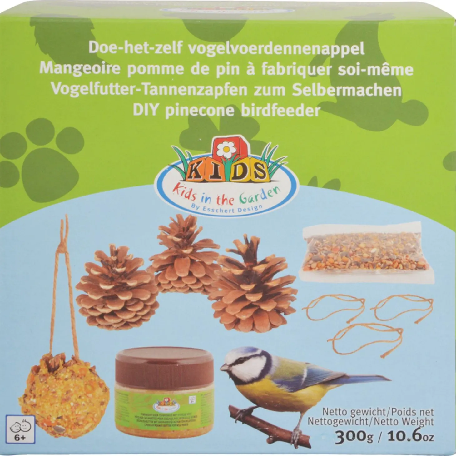 | Samenstelling | Dennenappels, jute touw, ingredienten: maïs, vet, koolzaadolie, pindameel, tarwe, gierst, zwarte zonnebloempitten, erwten, bonen, gehakseld maïs, witte sorgo, rijst, haver, rode sorgo, gestreepte zonnebloempitten. |