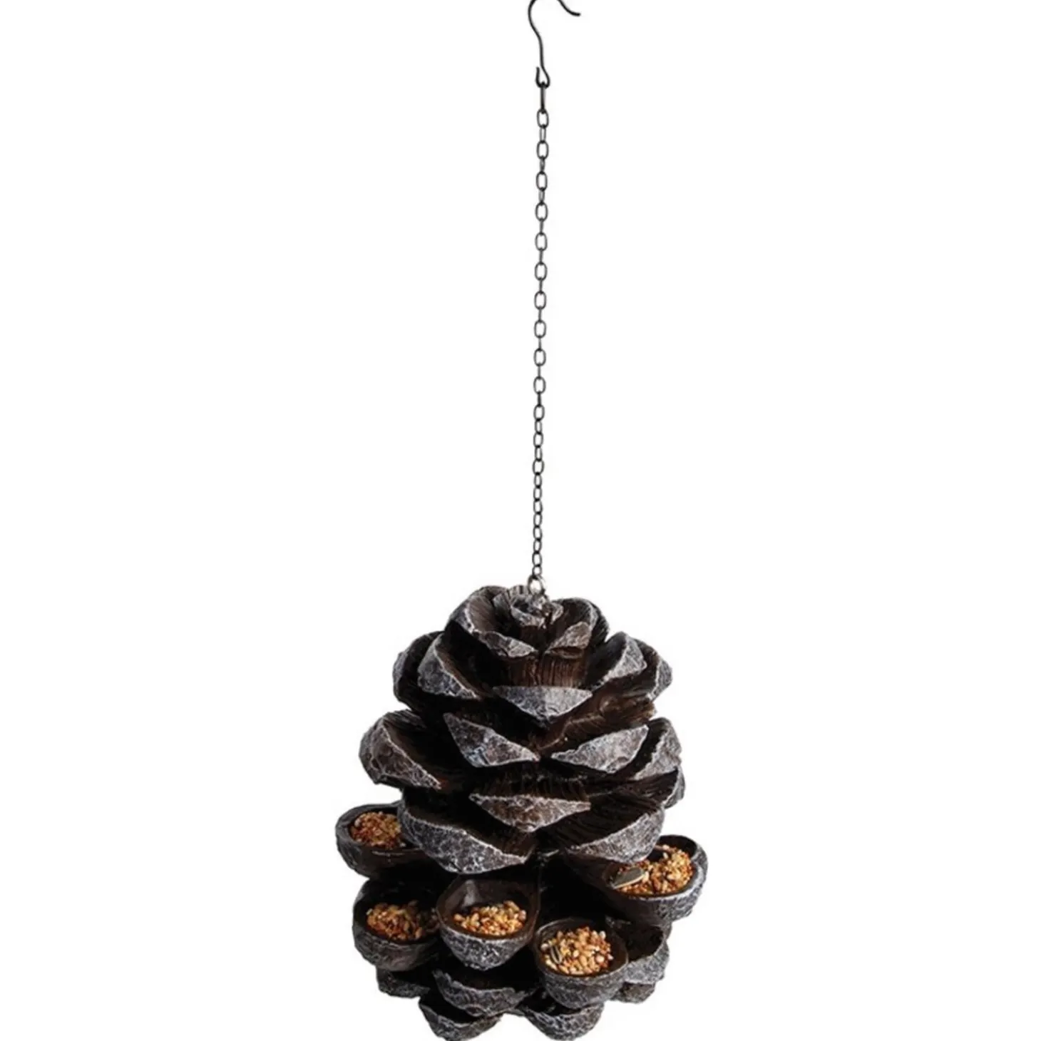 In de herfst en wintermaanden kunnen tuinvogels wel wat extra voeding gebruiken. Deze decoratieve dennenappelhanger biedt kleine tuinvogels een goede voederplek waar ze van alle kanten bij kunnen om te smikkelen. Je kan het voer op de opengeklapte schubben plaatsen en ophangen aan de bijgeleverde ketting.