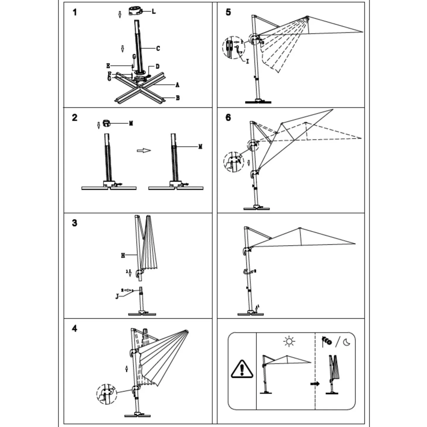 De Bestgarden Zweefparasol King Roma Antraciet 3x3m is gemaakt van hoogwaardige materialen en is ontworpen voor langdurig gebruik. Het stevige gepoedercoate aluminium frame in antracietkleur is weerbestendig en bestand tegen wind en regen. Het gesponnen polyester doek met een dichtheid van 230 g/m² is waterdicht, schimmelwerend en biedt UPF 50+ bescherming tegen schadelijke UV-stralen. De lichtechtheid van niveau 7 zorgt ervoor dat de kleur van het doek langdurig mooi blijft.De parasol is eenvoudig te bedienen met het handige cranksysteem en zwenksysteem. Hiermee kun je de parasol eenvoudig openen en sluiten, de hellingshoek van het doek aanpassen en de parasol 360 graden draaien. De kruisvoet met rotatiesysteem zorgt voor stabiliteit en maakt het mogelijk om de parasol eenvoudig te verplaatsen.