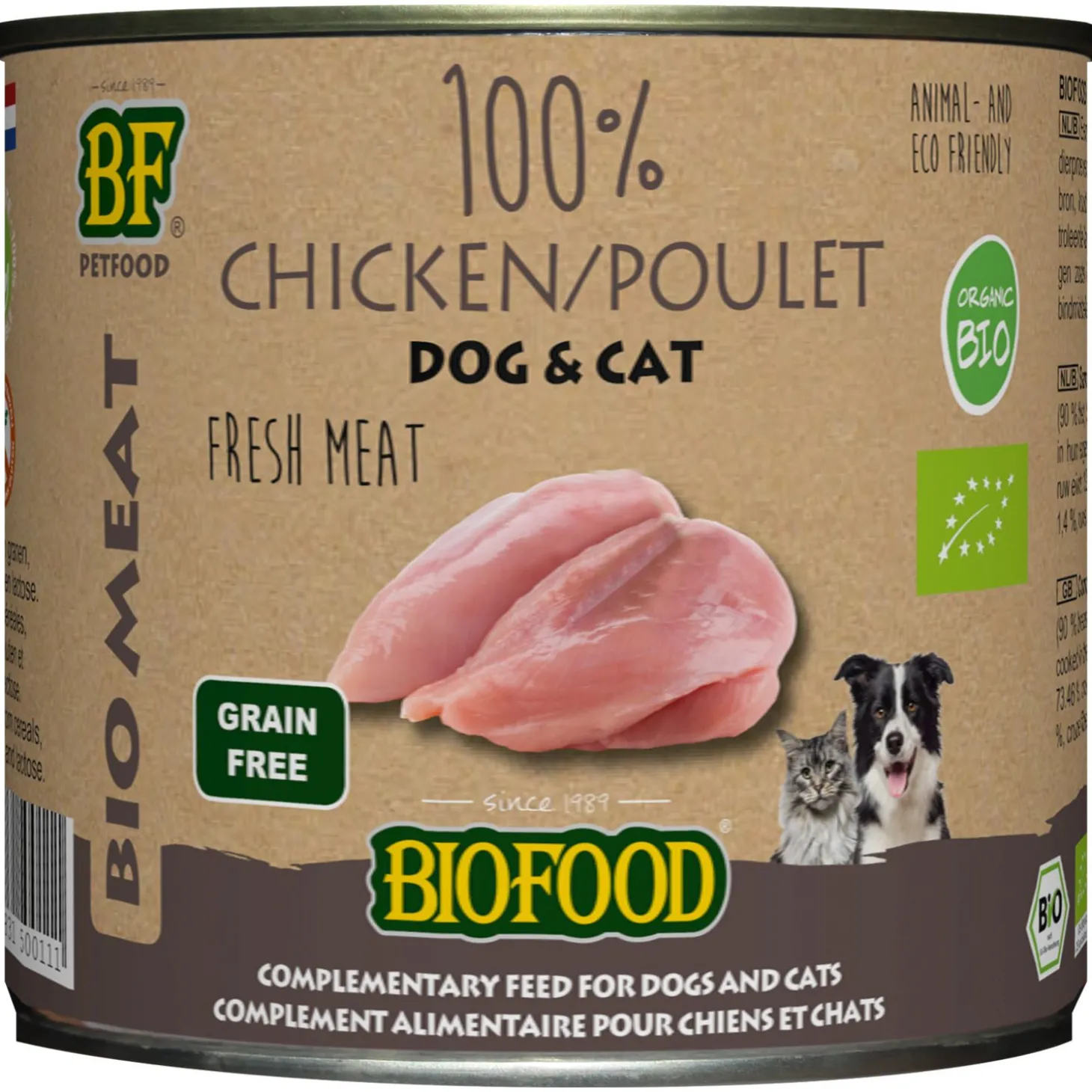 Organic 100% Kip van Biofood is verkrijgbaar in een blik van 200g en 400g