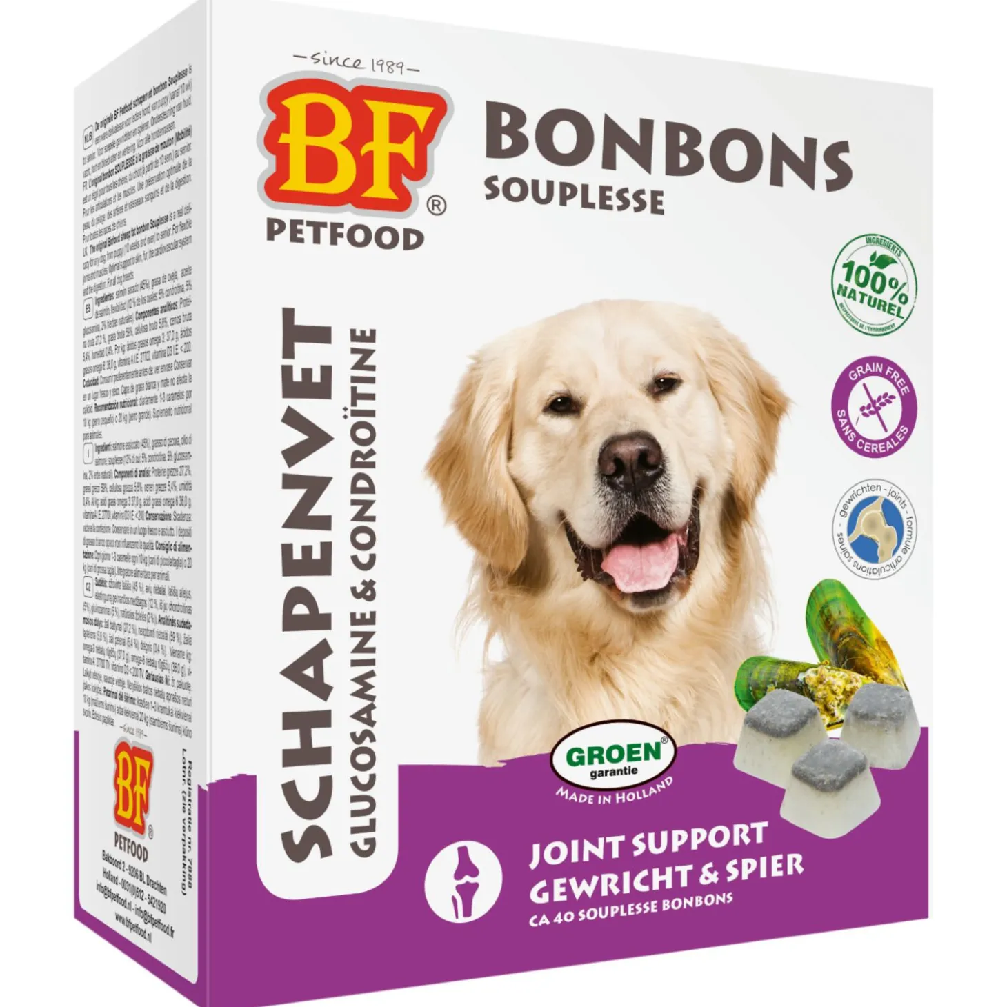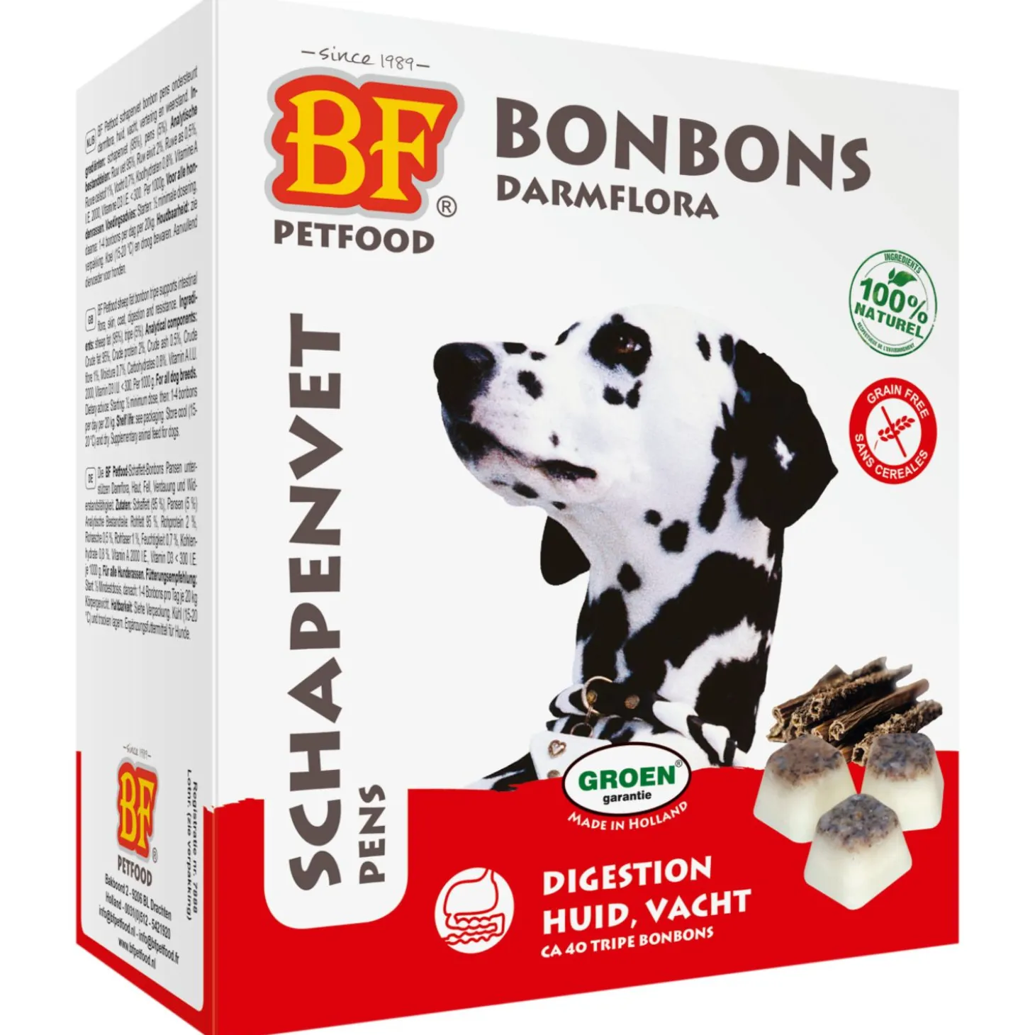 Het toevoegen van Schapenvet aan een goede voeding is altijd een goede keus. Schapenvet bevat ongeveer 58% verzadigde vetzuren en ongeveer 32% enkelvoudig onverzadigde vetzuren. Vet is niet alleen een smaakmaker maar ook belangrijk bij het transport van vitamine A, D, E en K in het lichaam. Het vetmetabolisme van een hond gaat zeer efficiënt om met vet en zet dit gemakkelijk om in energie. De originele Schapenvet Maxi van Biofood is een natuurlijk product. Schapenvet is goed in te zetten ter ondersteuning van afweer, huid, vacht, (spijs)vertering en weerstand. Daarnaast kan, de knoflook variant, vlo en teek afwerend werken. De Zalm bonbon is weer rijk aan omega 3 en 6 vetzuren. In de Pens bonbon zit met zorg geselecteerde pens, deze bevat noodzakelijke bacteriën en enzymen voor de darmflora. Schapenvet is een erg gezonde en smaakvolle toevoeging op de dagelijkse voeding van je hond. Ook geschikt voor honden met een voedselallergie.