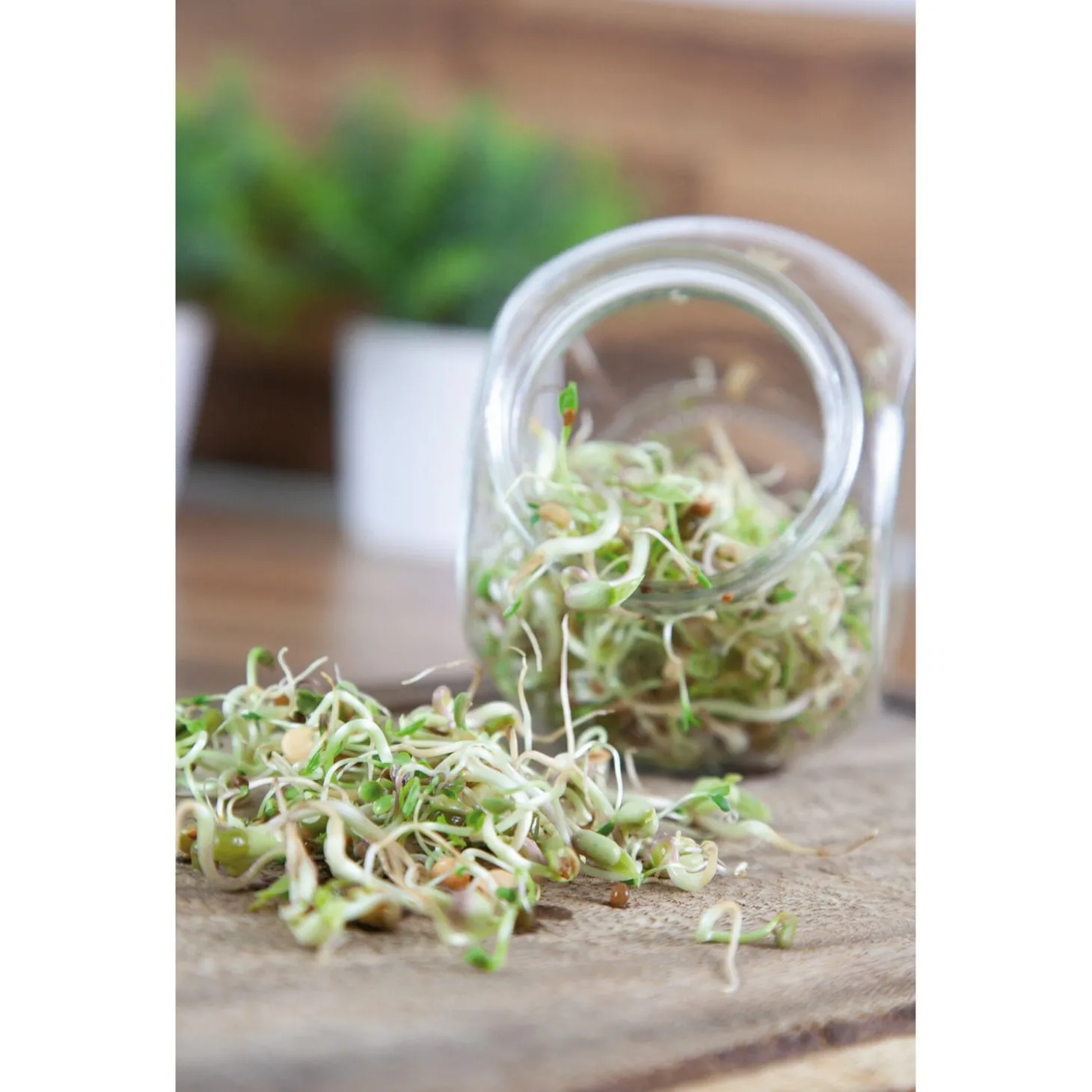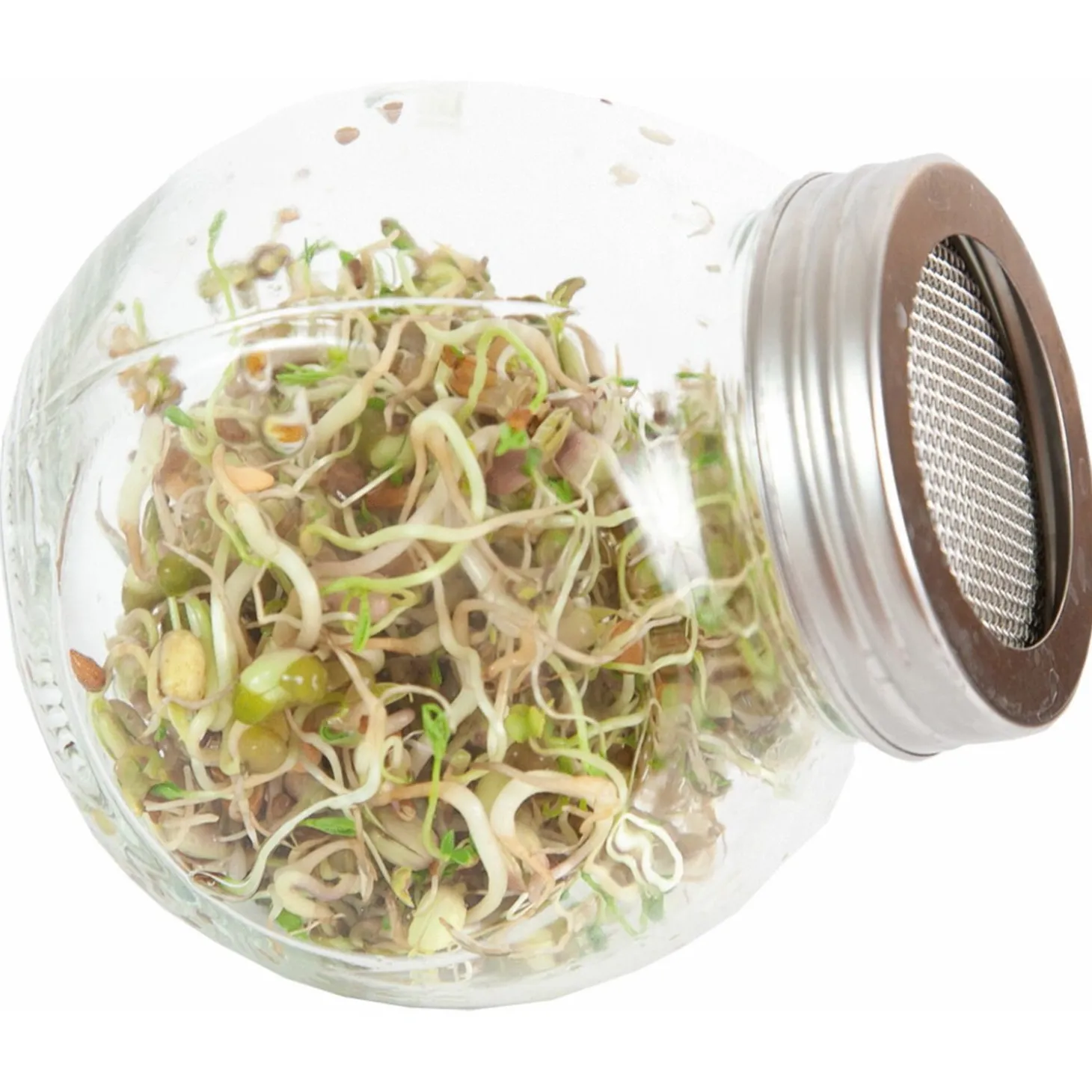 Eenvoudig spruitgroente kweken in een decoratieve glazen pot met RVS rooster.Strooi een lepel zaad in de kweekpotVoeg ruim lauw water toe.Draai deksel erop en goed afgietenSpoel 2 à 3 keer per dagZet kweekpot weg bij ca. 20 °CZakje Spruitgroente Salademix bijgeleverd.