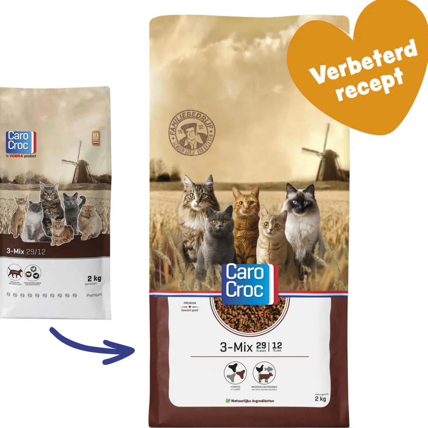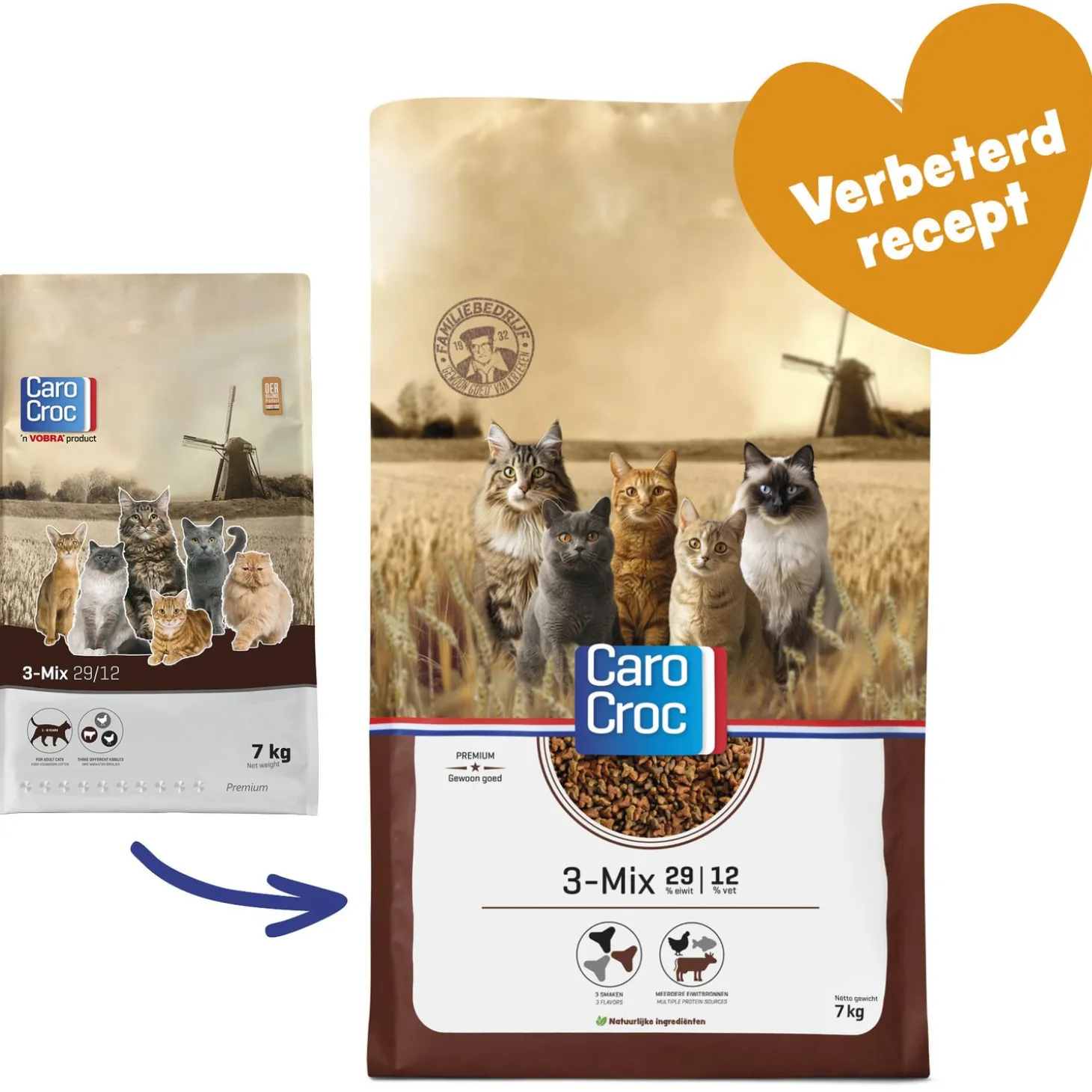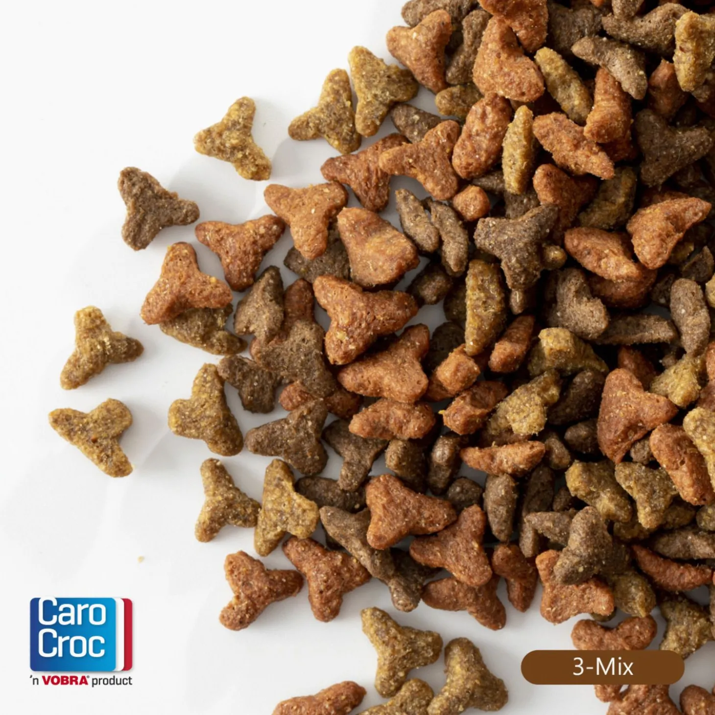 Een beetje variatie in de keuken. De CaroCroc 3-mix biedt woord bij de daad. Een gezonde brokvoeding met drie verschillende soorten in de mix, ieder brokje in zijn eigen kleur. Een kleurrijk geheel wanneer je het je kat voorschotelt. In de 3-mix zijn de smaken gevogelte en rund terug te vinden. Een geschikte voeding voor de volwassen kat.