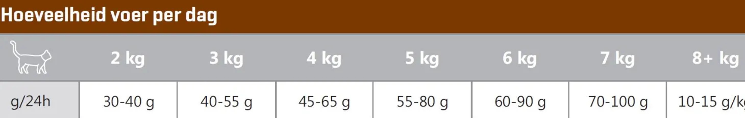 | Aanbeveling | Volg het voedingsschema in de tabel, maar pas eventueel de voerhoeveelheid aan om het ideale gewicht van uw kat te handhaven. Verdeel de dagelijkse voerhoeveelheid over twee of meer maaltijden per dag. Houd de conditie van uw kat steeds goed in de gaten en zorg dat er altijd vers en schoon drinkwater beschikbaar is. |