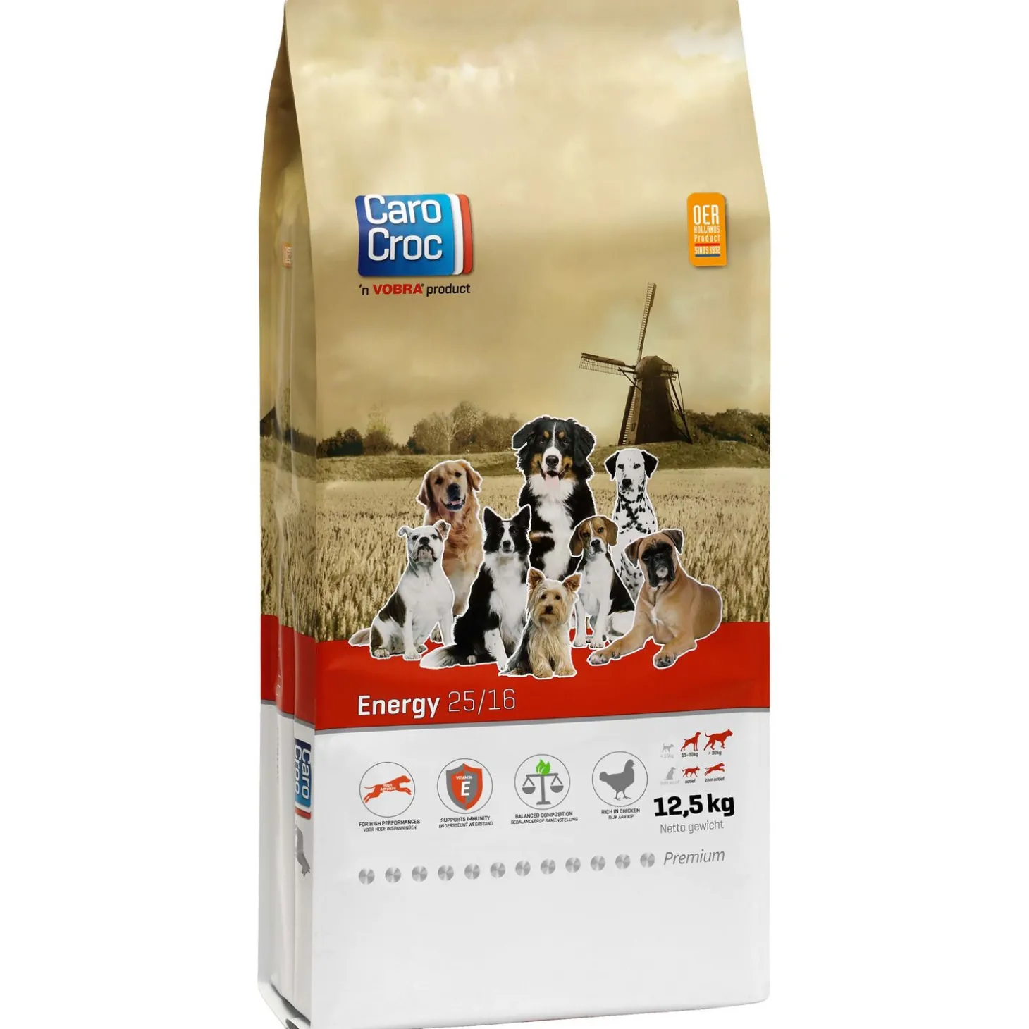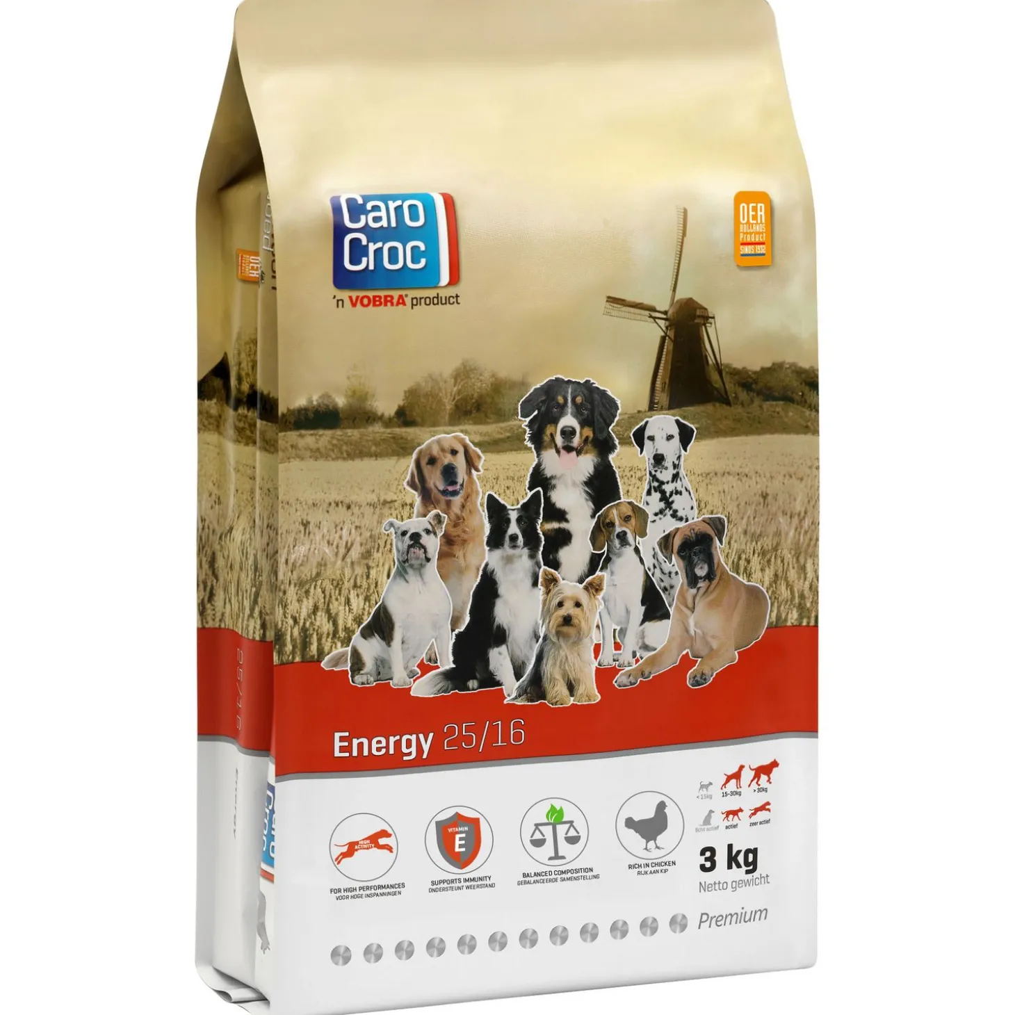 Door de vele energie die er verbruikt wordt bij grote inspanning is het natuurlijk logisch dat dit vraagt om een hoge energiebehoefte. De verbruikte energie moet namelijk ook weer aangevuld worden. De energie in de CaroCroc Energy hondenvoeding vormt zich door een uniek eiwit- en vetgehalte. Deze zijn dusdanig afgestemd dat jouw hond alle energie krijgt die hij nodig heeft. De brokken bevatten een eiwitpercentage van 25% en een vetpercentage van 16%. Deze percentages liggen een stuk hoger dan bij een gemiddelde volwassen hondenvoeding. Dit noemen we het voeren naar energiebehoefte, zoals de CaroCroc filosofie voorlegt. De CaroCroc Energy is geschikt voor volwassen die zware inspanning moeten verlenen. Het brokje heeft een diameter van 17mm.