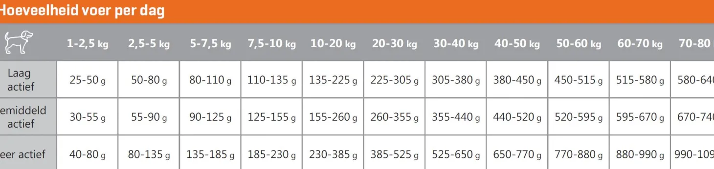 | Aanbeveling | Volg het voedingsschema in de tabel, maar pas eventueel de voerhoeveelheid aan om het ideale gewicht van uw hond te handhaven. Verdeel de dagelijkse voerhoeveelheid over twee of meer maaltijden per dag. Houd de conditie van uw hond steeds goed in de gaten en zorg dat er altijd vers en schoon drinkwater beschikbaar is. |