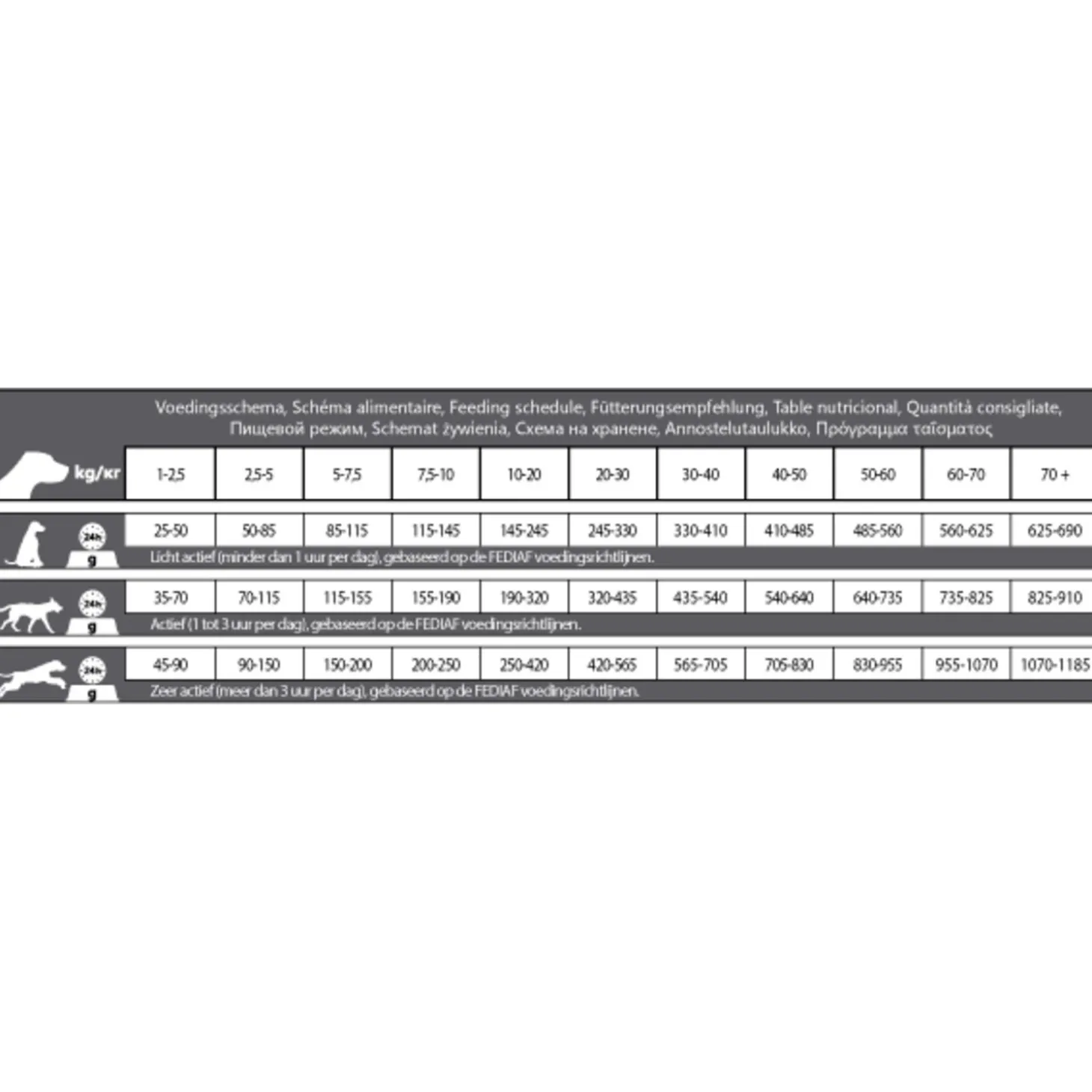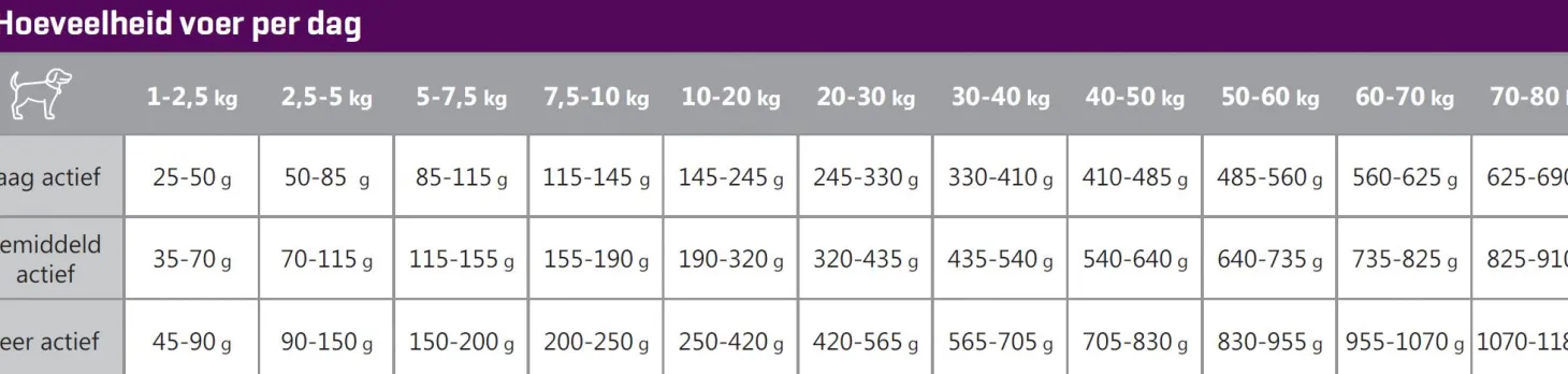 | Aanbeveling | Volg het voedingsschema in de tabel, maar pas eventueel de voerhoeveelheid aan om het ideale gewicht van uw hond te handhaven. Verdeel de dagelijkse voerhoeveelheid over twee of meer maaltijden per dag. Houd de conditie van uw hond steeds goed in de gaten en zorg dat er altijd vers en schoon drinkwater beschikbaar is. |