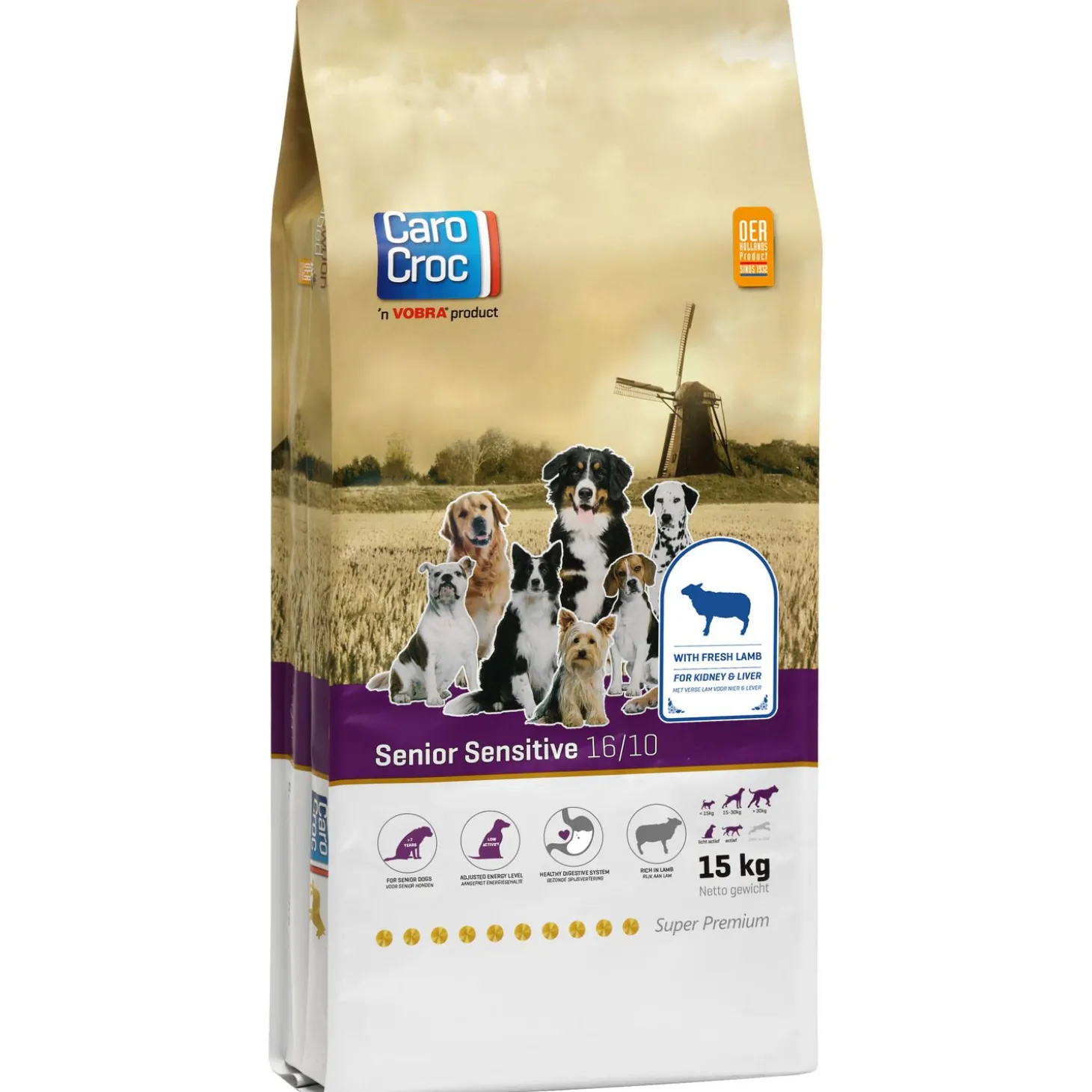 Een goed en licht verteerbare voeding is zeer wenselijk. De verse lam in de CaroCroc Senior Sensitive voldoet hier uitstekend aan. Door de hoge licht verteerbaarheid ondersteunt het oudere honden met een gevoelige huid, maag of darmen. Deze brok is daarnaast rijk aan veel antioxidanten, waaronder extra vitamine E, welke er zorg voor dragen dat de weerstand van je hond goed wordt ondersteund en cel veroudering tegengaat. De Omega 3- en 6 vetzuren dragen bij aan een gezonde nier- en leverfunctie. De CaroCroc Senior Sensitive is geschikt voor honden vanaf 7 jaar die duidelijke ouderdomsverschijnselen tonen. Het brokje heeft een diameter van 15mm.