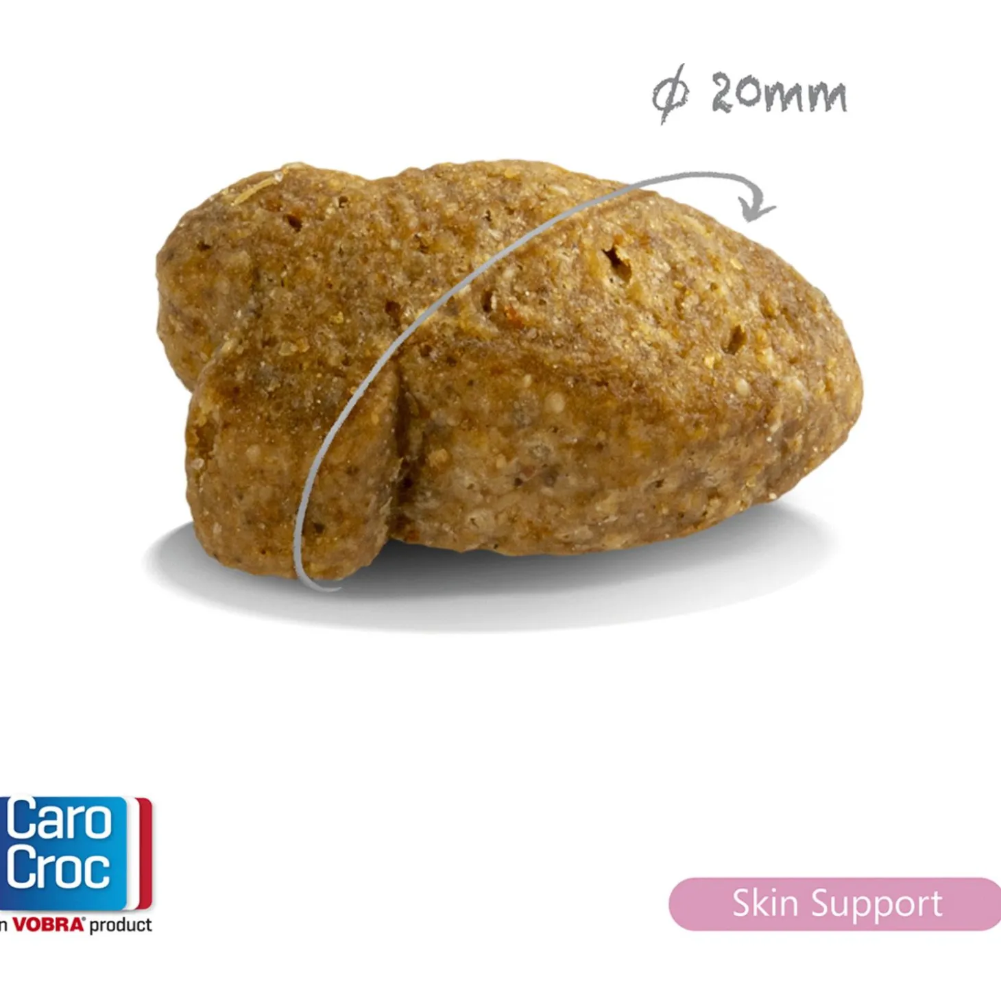 Om het juiste resultaat te behalen en de huid en vacht van je hond goed te kunnen ondersteunen, bevatten de brokken van CaroCroc Skin Support verse zalm en zalmolie. Daarnaast bevat de Skin Support essentiële omega 3- en 6 vetzuren die bijdragen aan de gezondheid van je dier, maar niet door het lichaam zelf kunnen worden aangemaakt. Met toevoegingen zoals deze worden onder andere de weerstand, stofwisseling en vacht extra ondersteund. De CaroCroc Skin Support is tarwegluten vrij wat ook zijn positieve werking heeft op de huid en vacht van je hond. De CaroCroc Skin Support is geschikt voor volwassen honden die extra ondersteuning nodig hebben voor een gezonde huid en vacht. Het brokje heeft een diameter van 20mm.