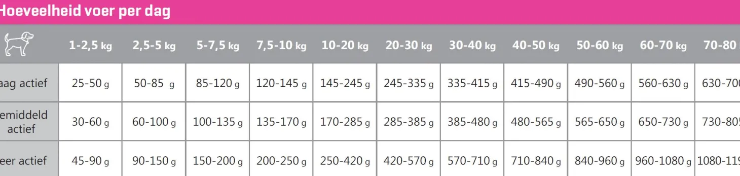 | Aanbeveling | Volg het voedingsschema in de tabel, maar pas eventueel de voerhoeveelheid aan om het ideale gewicht van uw hond te handhaven. Verdeel de dagelijkse voerhoeveelheid over twee of meer maaltijden per dag. Houd de conditie van uw hond steeds goed in de gaten en zorg dat er altijd vers en schoon drinkwater beschikbaar is. |