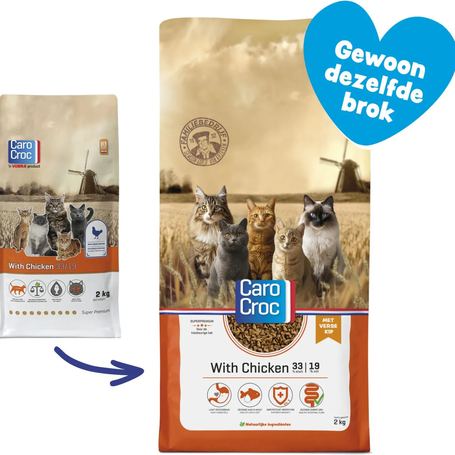 De CaroCroc With Chicken staat er niet alleen voor. Voor de echte fijnproevers heeft het CaroCroc assortiment ook smaken met verse vis of met verse lam. Het CaroCroc assortiment bestaat uit hoogwaardige ingrediënten en bevatten geen kunstmatige geur-, kleur- en smaakstoffen. Deze voeding is geschikt voor volwassen katten van alle rassen met een leeftijd tot 8 jaar. Het brokje, een ster achtige vorm, heeft een diameter van 13mm.