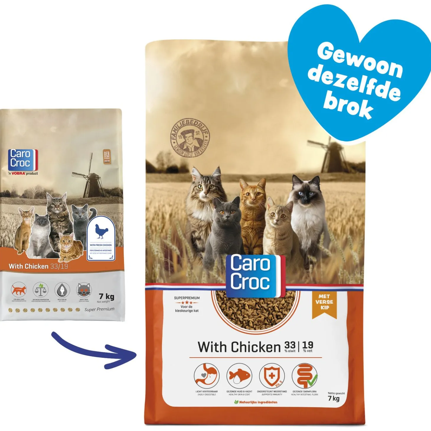 De CaroCroc With Chicken is een volledige voeding voor de volwassen kat. Zoals de naam het eigenlijk al zegt is deze voeding op basis van verse kip. De ‘With Chicken’ staat voor het hoge aandeel gevogelte in deze voeding en is zeer smakelijk en licht verteerbaar. De brokken bevatten prebiotica wat bijdraagt ter ondersteuning van gezonde darmen van jouw huistijger. Deze voeding bevat alle voedingsstoffen die jouw volwassen kat nodig heeft.