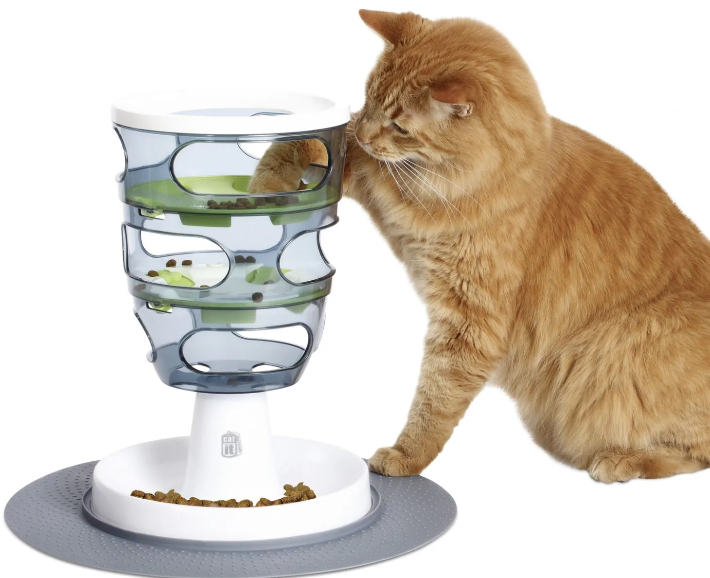 De Catit Food Maze stel je op verschillende moeilijkheidsgraden in door de groene schijven in het midden te draaien. Je kat kan zijn eten ook te pakken krijgen door de brokjes met zijn pootje te pakken door de openingen in de zijkant. De blauwe mat met noppen stimuleert de pootjes van je kat.
