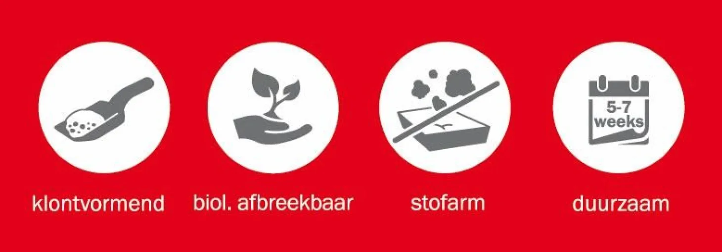- Klontvormend: de vulling klontert om de urine en ontlasting op te vangen, waardoor het schoonmaken van de kattenbak eenvoudig is.