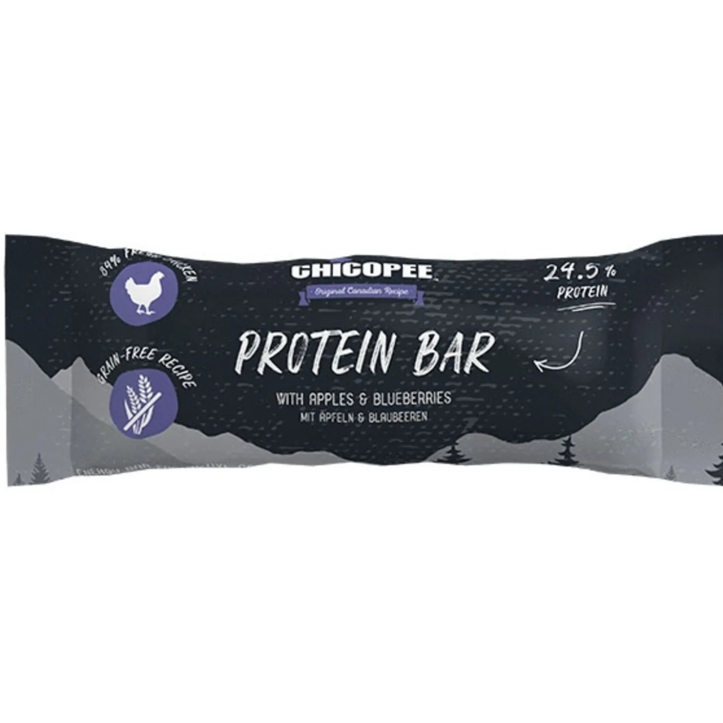 | Samenstelling | Vers kippenvlees (64%), verse kip (20%), plantaardige bijproducten, appels (gedroogd, 1%), bosbessen (gedroogd, 1%), mineralen. |