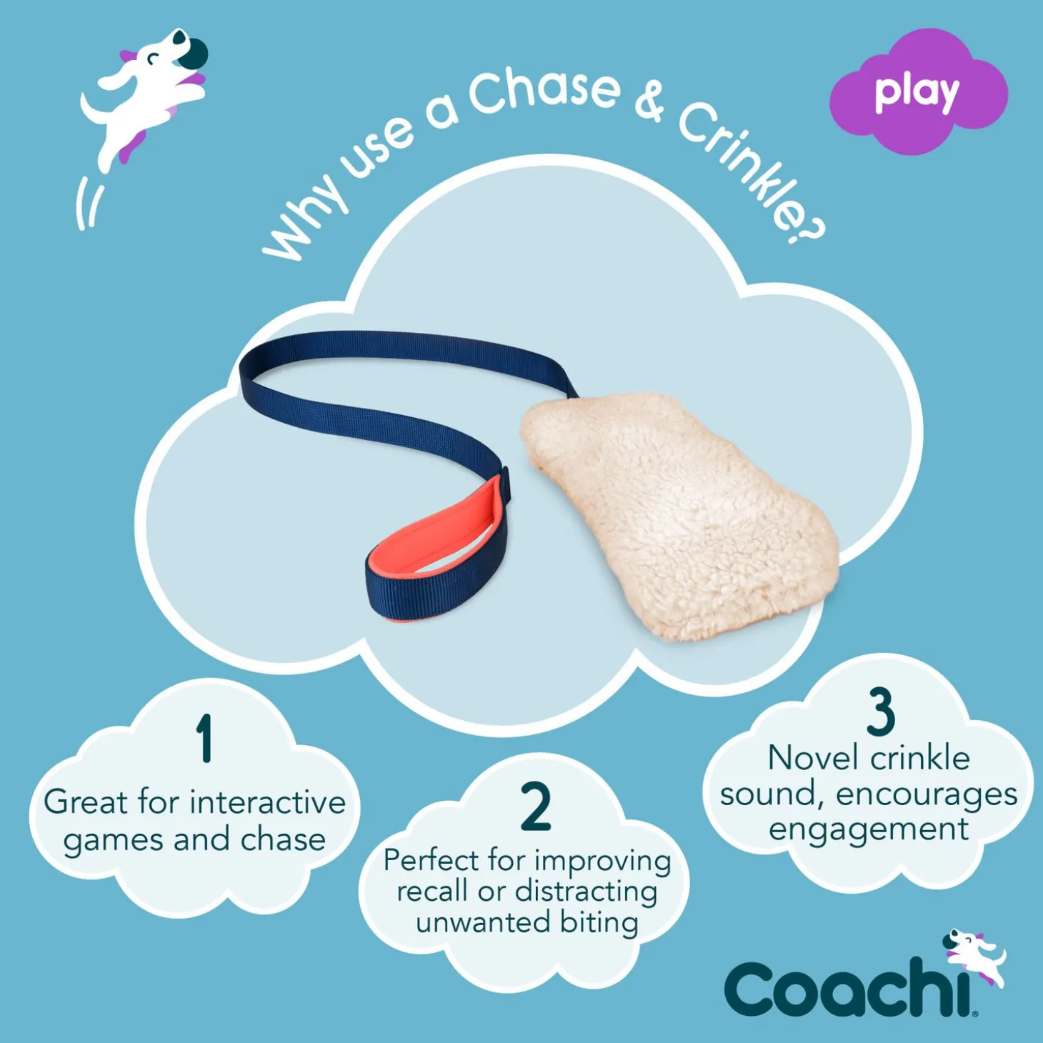 Is het tijd voor een nieuw sterk speeltje voor je hond of puppy? Kijk dan eens naar de Coachi Chase & Crinkle! Dit zachte kreukspeeltje gemaakt van faux lamswol is perfect te gebruiken als trek- of werpspeelgoed. Ook kan het een handig hulpmiddel zijn bij apporteertraining of fungeren als beloning. Laat je hond ongewenst gedrag zien zoals bijten of kauwen? Gebruik dan de Chase & Crinkle als afleiding en leer het gedrag af.