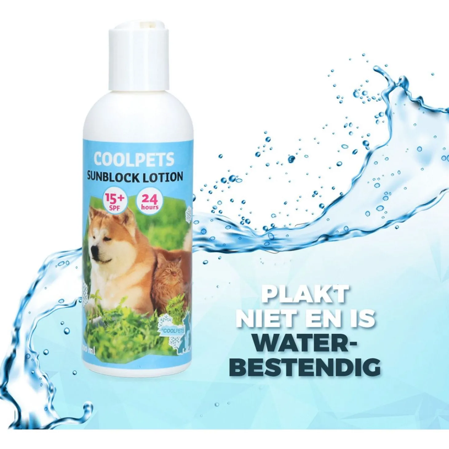 - De CoolPets Sunblock Lotion heeft een SPF van 15+, biedt 24 uur lang bescherming en is waterbestendig!