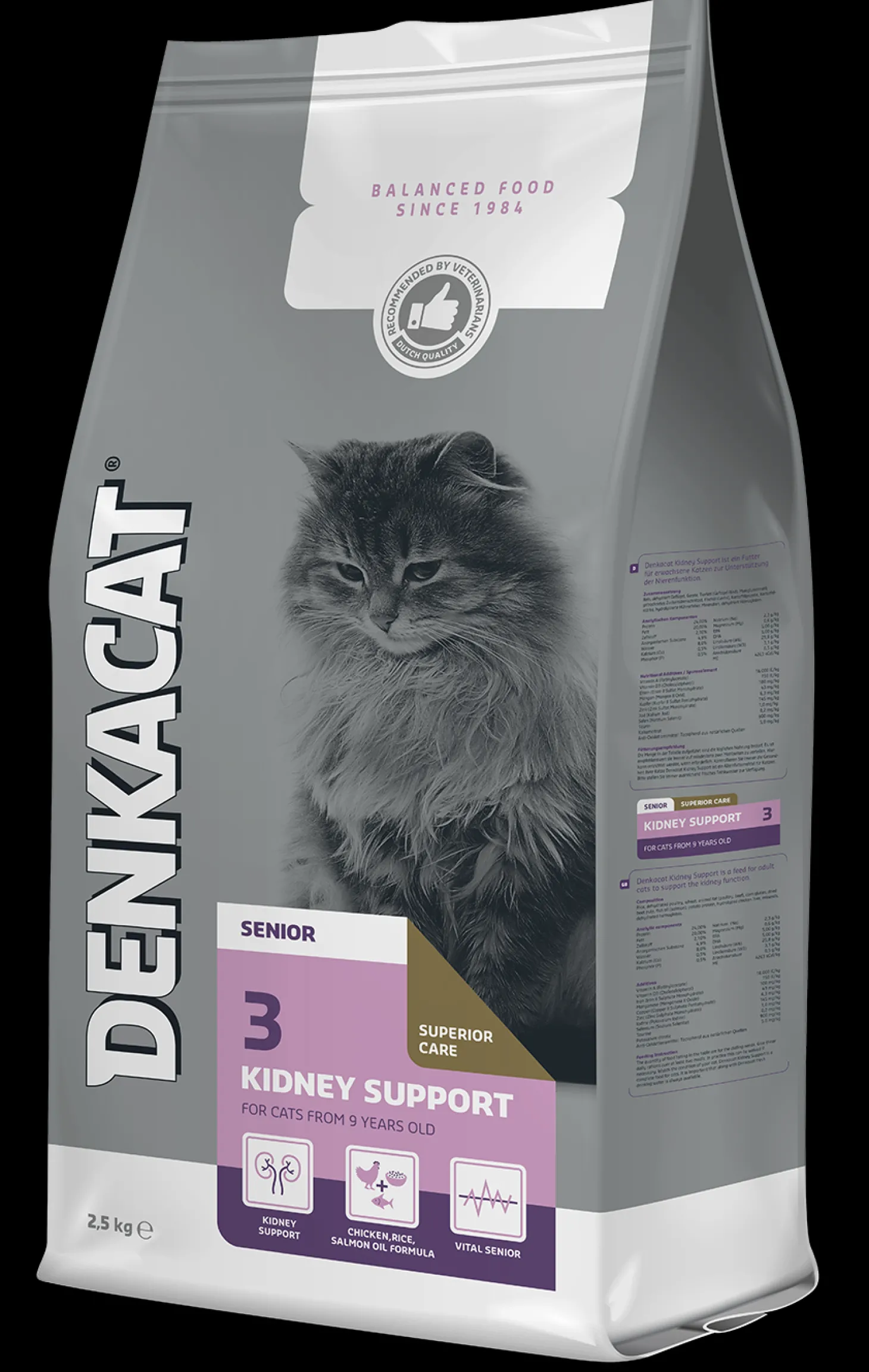 - Denkacat Kidney Support is een complete voeding, speciaal voor katten ouder dan 9 jaar. Deze balansvoeding is afgestemd op de speciale voedingsbehoefte van je senior kat en heeft een verlaagd percentage eiwitten, calcium, fosfor en mineralen. Dit voorkomt nierproblemen. Denkacat Kidney Support bevat kip wat licht verteerbaar, smakelijk en gezond is. Met extra lecithine wat de vacht in goede conditie houdt. De brokjes zijn gemakkelijk te kauwen. Reinigen het gebit op een natuurlijke manier en zorgen voor een goede doorbloeding van het tandvlees.