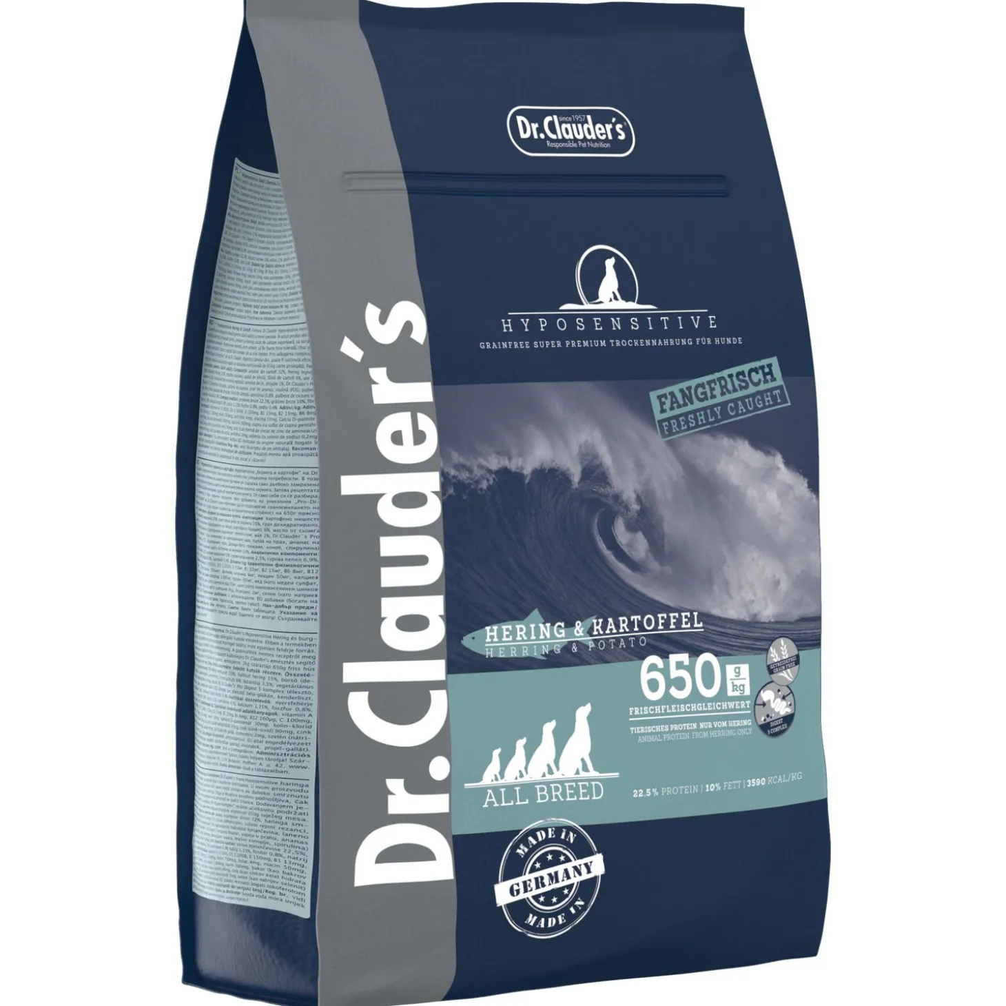 | Samenstelling | Ingrediënten: aardappelzetmeel 32%, haring bevroren 20%, vismeel van de haring 15%, erwten (gedroogd), bietenpulp, aardappelmeel 6%, zalm olie 3,5%, vegetarische eiwithydrolysaat, lijnzaad, gist 1%, Dr.Clauder´s Pro Digest 5 Complex (gist, papaya poeder, ananas poeder, inuline (FOS), cranberry poeder, beta glucanen van gisten, hennepmeel, spirulina) 0,8%, cichorei poeder (als bron voor inuline) 0,4%.Toevoegingsmiddelen/kg: Nutritionele toevoegingsmiddelen: vitaminen A 15.000IE, D3 1.200IE, E 150mg, B1 13mg, B2 13mg, B6 8mg, B12 160mcg, C 100mg, biotine 700mcg, foliumzuur 4mg, niacine 50mg, calcium-d-pantothenaat 30mg, Choline chloride 1.800mg, taurine 300mg, koper (zoals kopersulfaat pentahydraat) 10mg, zink (als zink oxide) 90mg, zink (als zink aminozuur chelaat, hydraat) 45mg, Jodium (als calciumjodaat, watervrij) 2mg, selenium (als natriumseleniet) 0,2mg.Technologische toevoegingsmiddelen: antioxidanten. |