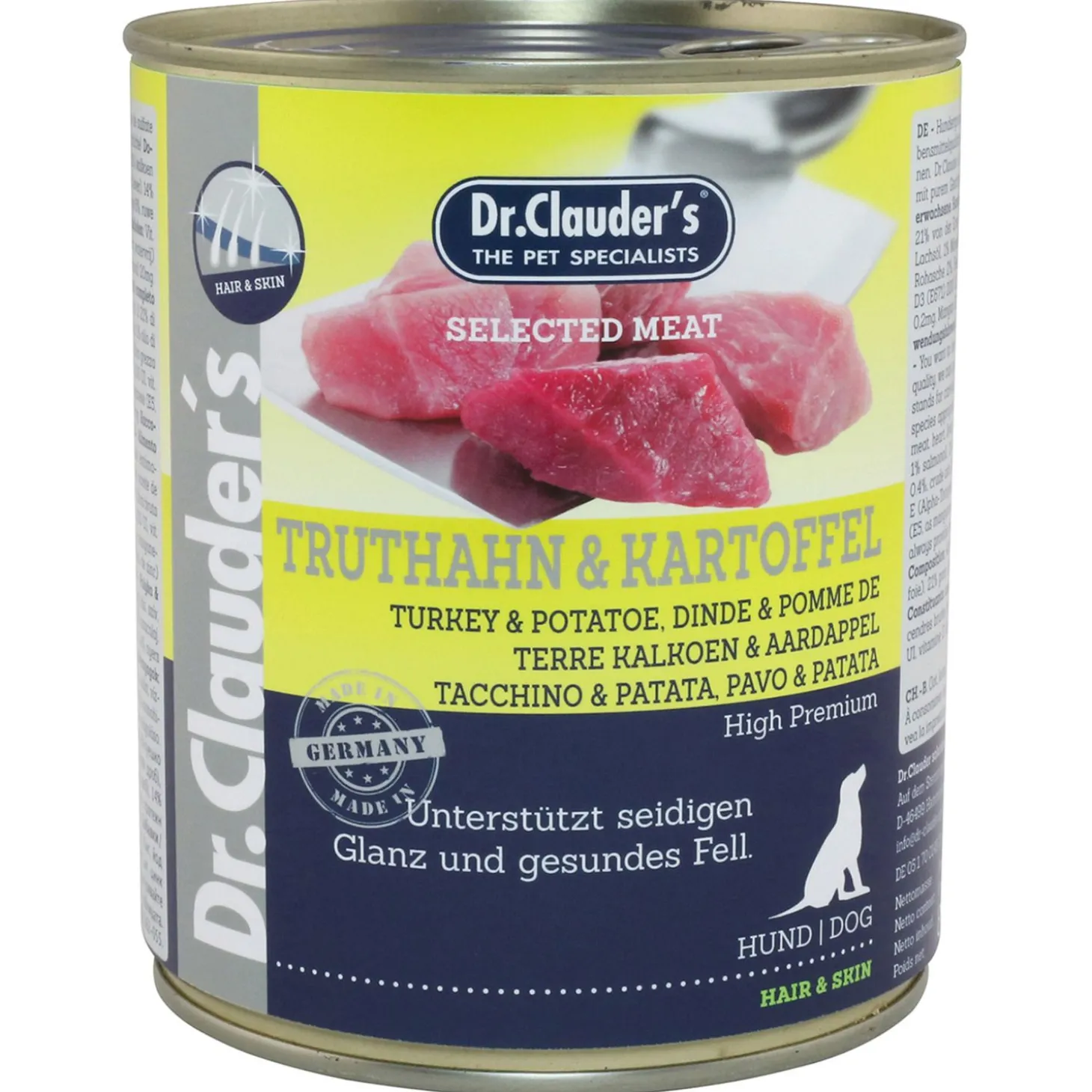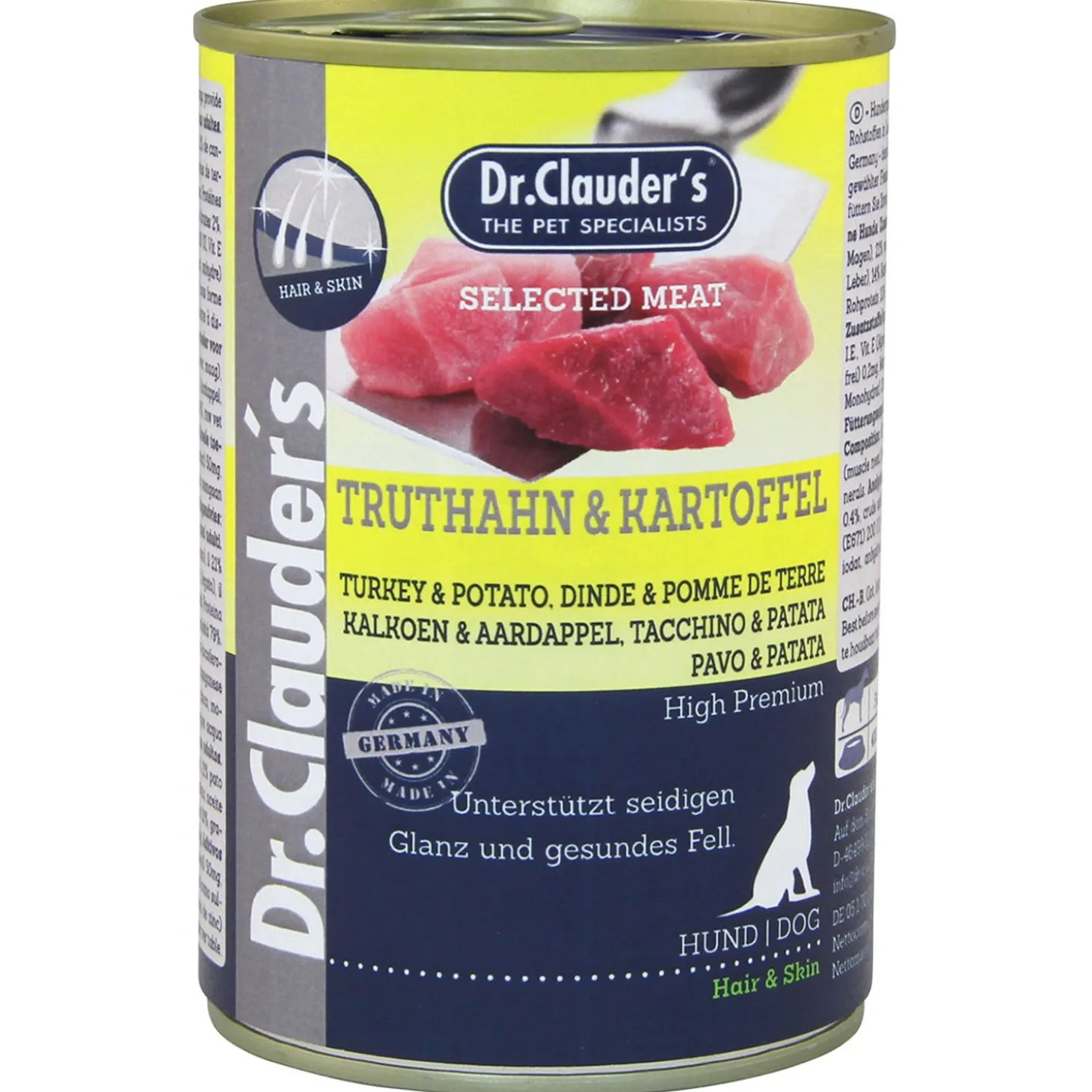 Dr. Clauder’s Selected Meat Kalkoen&Aardappel is een hoogwaardige premium natvoeding voor volwassen honden. Het is gemaakt van 100% vers vlees, waaronder kalkoen, eend en varken. Deze ingrediënten zijn een bron van eiwitten, vetten en vitamines die belangrijk zijn voor de gezondheid van jouw hond.