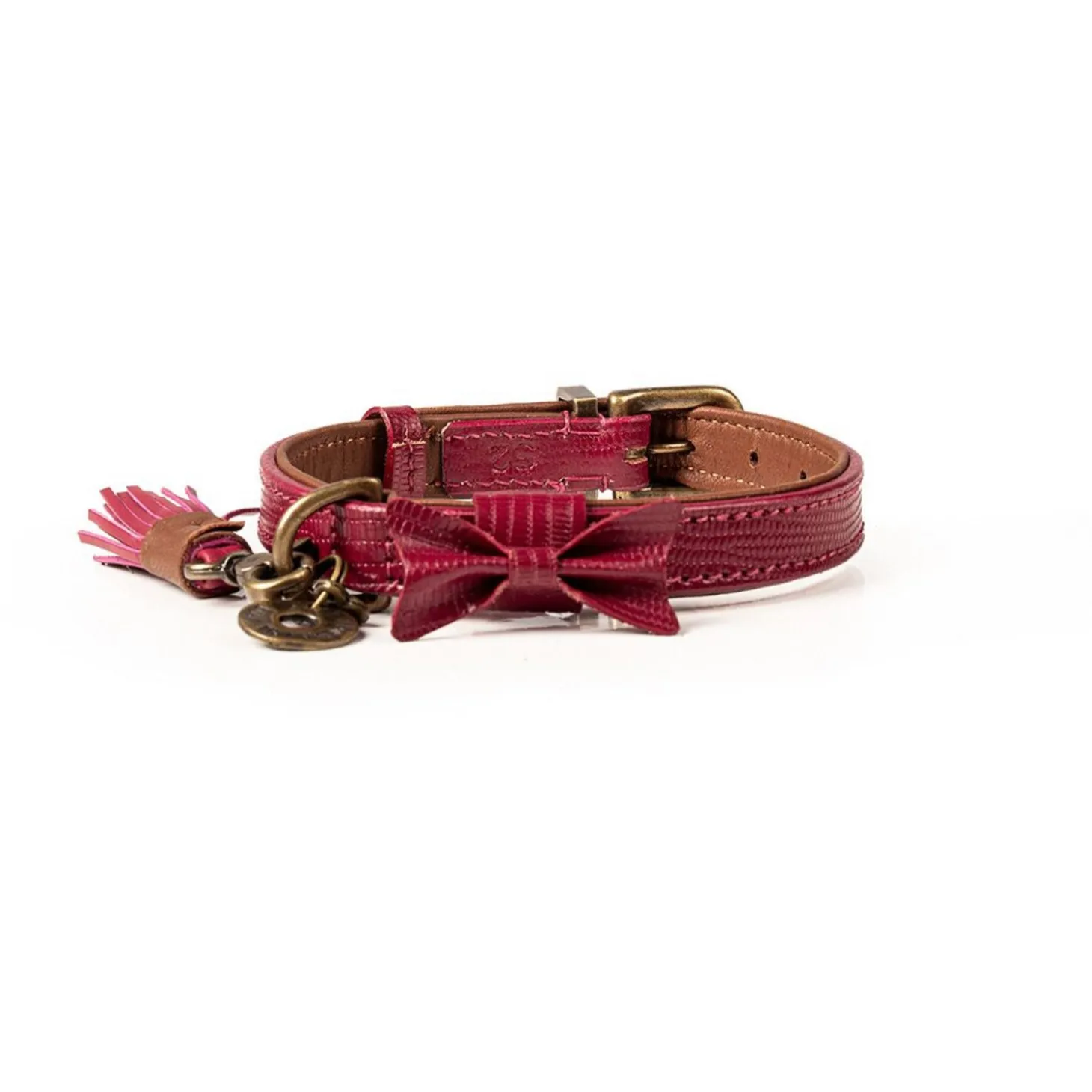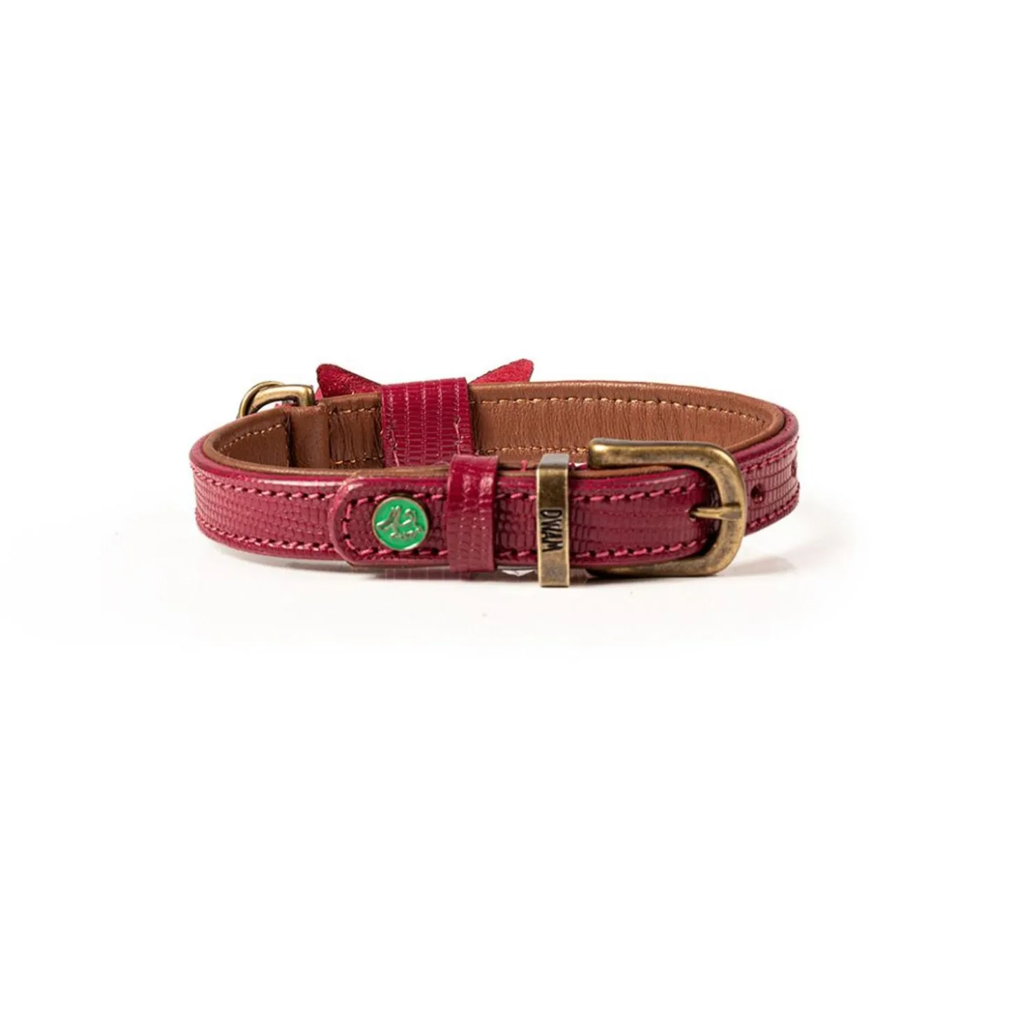 Wanneer je op pad gaat met je hond, wil je er natuurlijk wel flitsend uitzien. DWAM heeft een assortiment met prachtige riemen en halsbanden waarmee je hond er altijd stijlvol bij loopt. De Bonnie van Dog With A Mission is een handgemaakte, oersterke halsband voor je viervoeter. De Bonnie is gemaakt van bordeauxrood leer met voorop een verwijderbare, schattige strik. De halsband wordt afgemaakt met een bedeltje en een hagedissenprint.