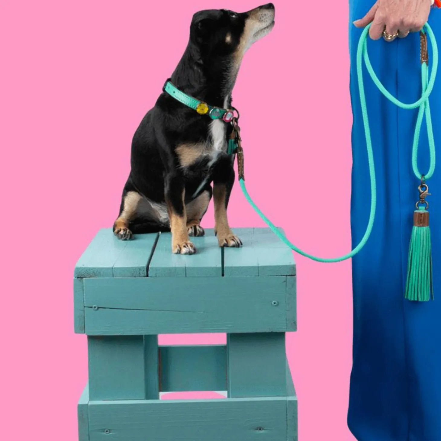 Wanneer je op pad gaat met je hond, wil je er natuurlijk wel flitsend uitzien. DWAM heeft een assortiment met prachtige riemen en halsbanden waarmee je hond er altijd stijlvol bij loopt. De Jade van Dog With A Mission is een handgemaakte, oersterke looplijn voor je viervoeter met een felle, turquoise kleur. De Jade is gemaakt van polyester touw waardoor deze wel tegen een stootje kan. De riem is verder afgewerkt met leren details voor een chique uiterlijk.