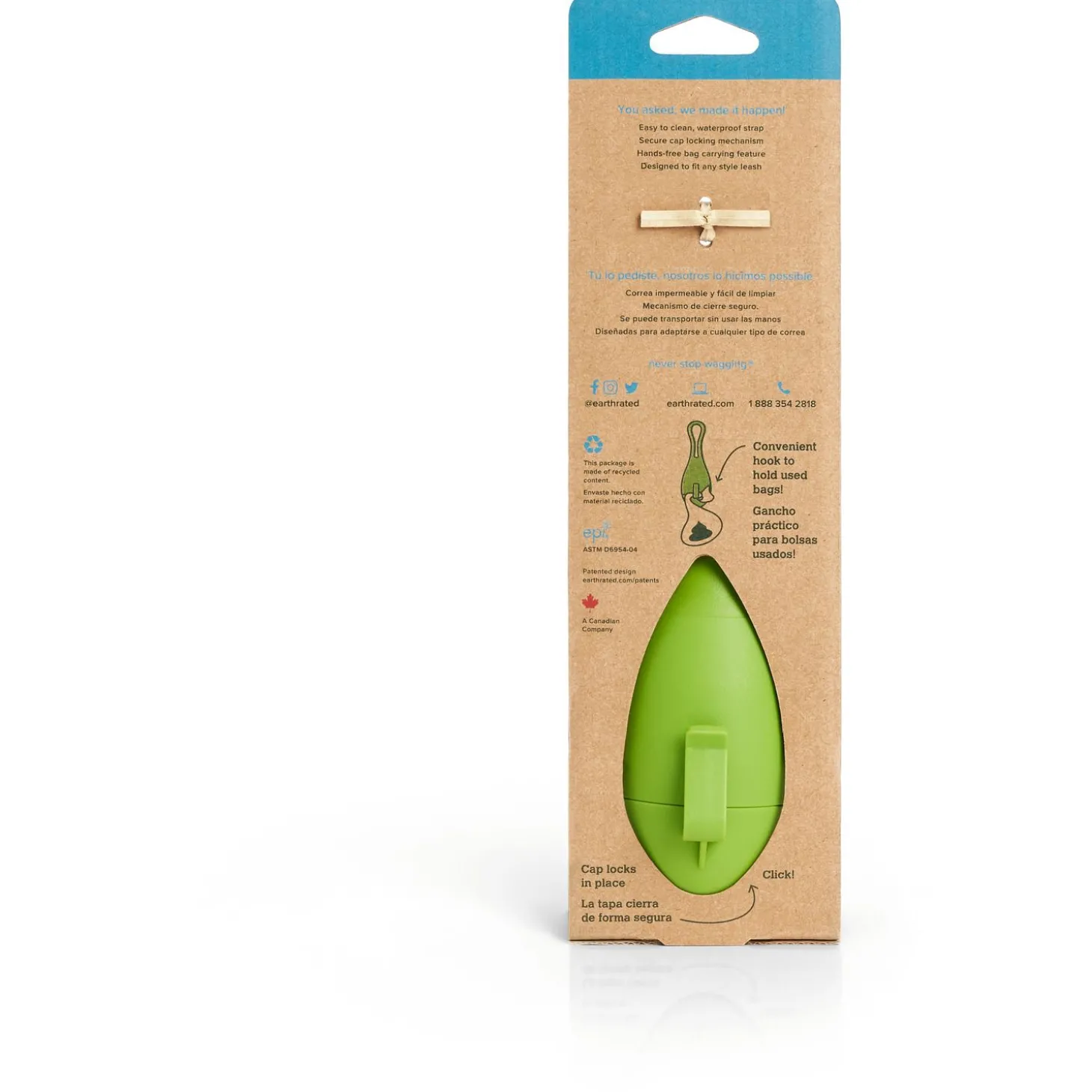 Er zit ook een haakje aan de houder waar je een gevuld zakje aan kunt hangen totdat je een prullenbak hebt gevonden. De Earth Rated zakjes zijn lekvrij, van hoge kwaliteit en zijn zeer betaalbaar. Ook aan het milieu is gedacht, de kartonnen binnenrollen en de verpakking zijn gemaakt van gerecycled materiaal. Alle Earth Rated-rollen of andere rollen van standaardformaat passen in deze dispenser!