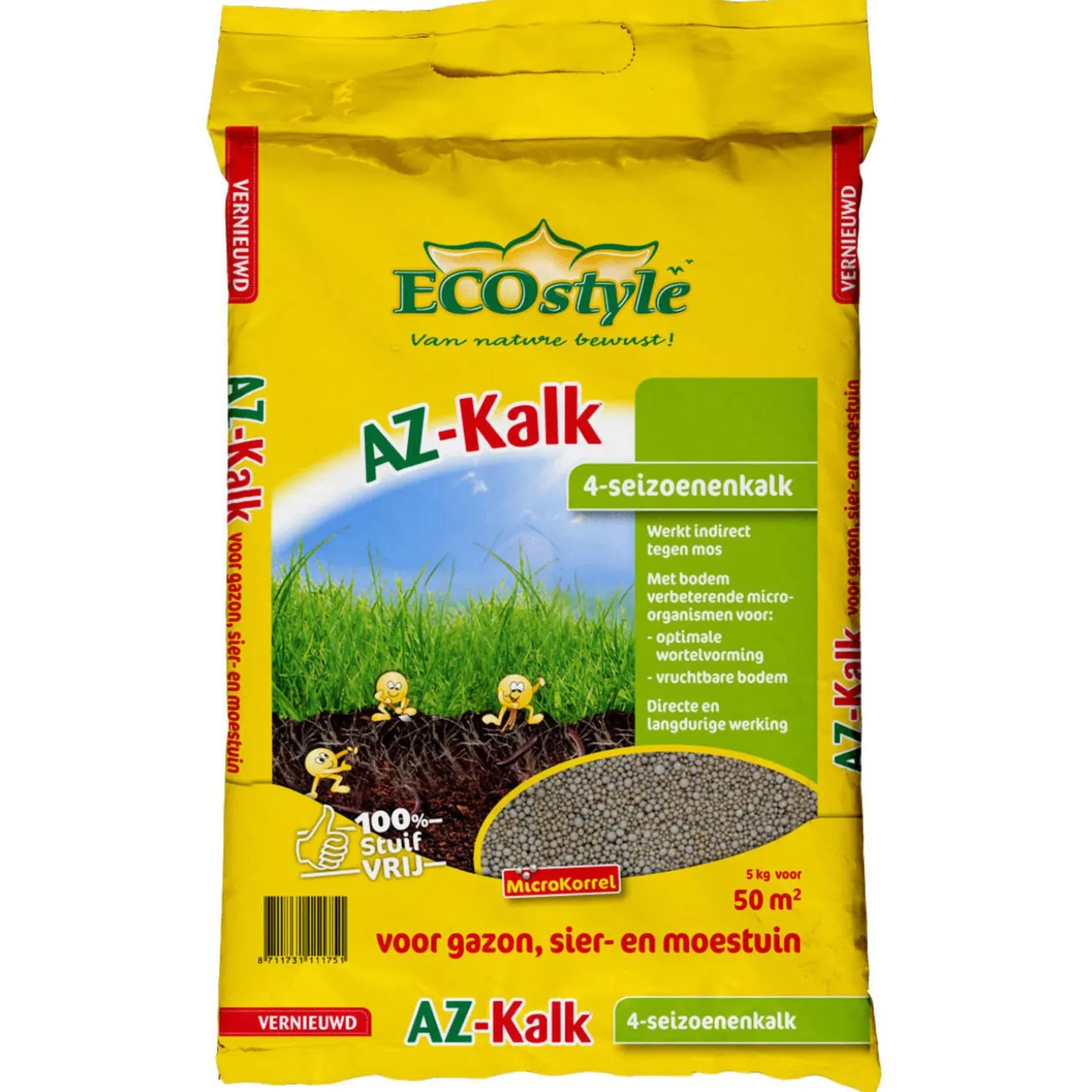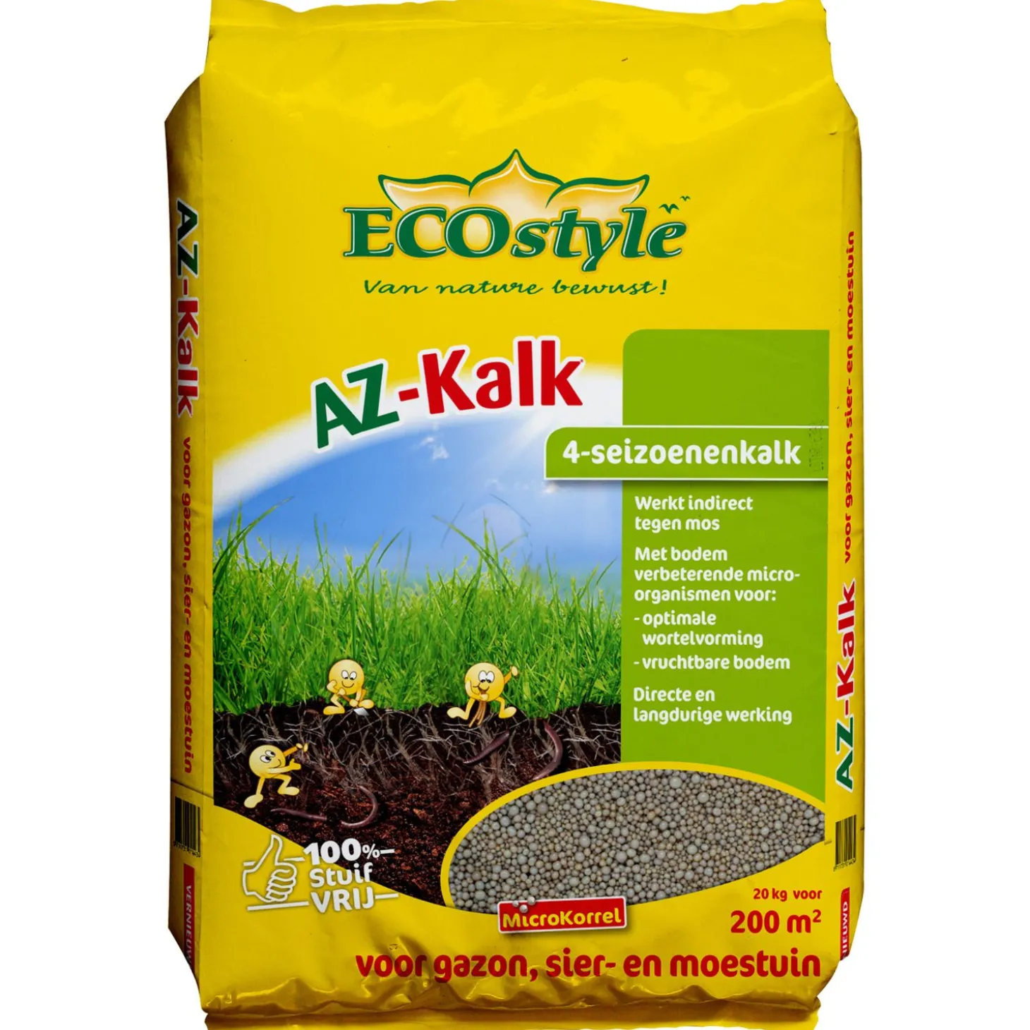 | Samenstelling | Gewicht: 2 kg. Afmeting: 20 m2. De AZ-Kalk van ECOstyle kunt u het gehele jaar door toepassen. Deze 1% stuifvrije kalk is gemakkelijk te verwerken en wordt snel opgenomen. |