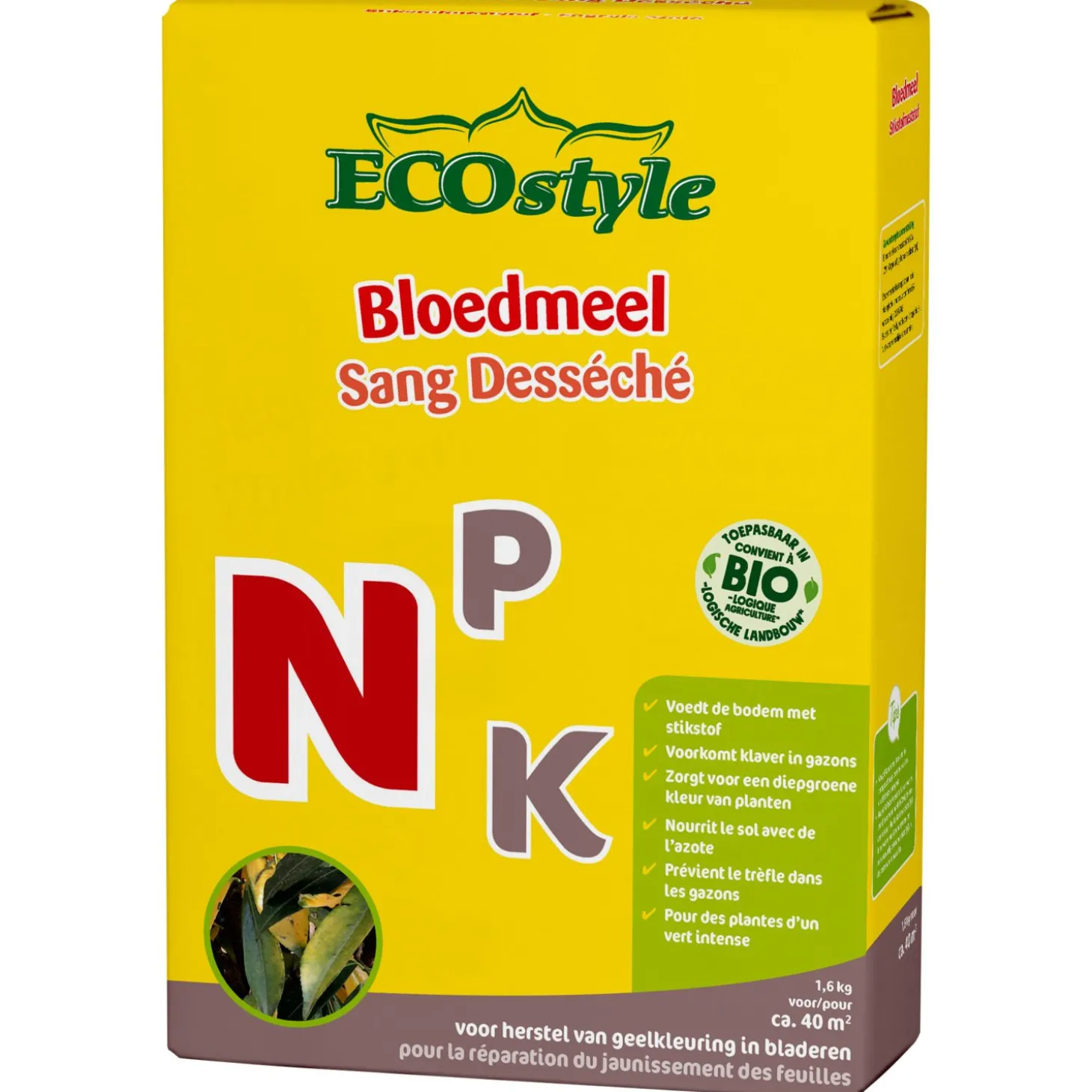 | Samenstelling | Gewicht: 1.6 kg. Afmeting: 40 m2. Bloedmeel (N) is een heel specifieke enkelvoudige meststof om stikstoftekorten in de bodem snel aan te vullen. Deze 1% natuurlijke meststof van ECOstyle, is geschikt voor een gerichte bemesting in de (moes)tuin. |
