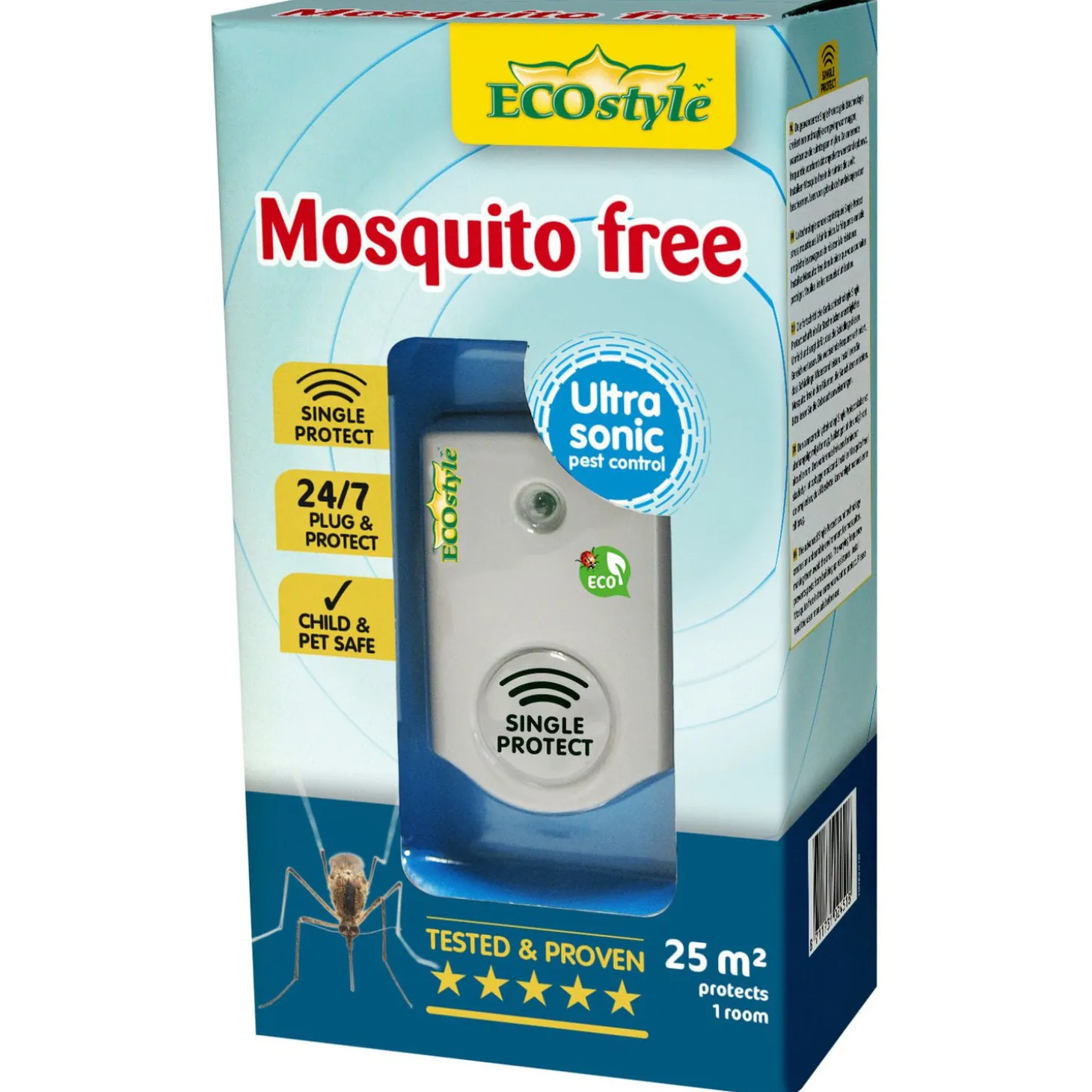 Niemand wordt blij van vervelende zoemende muggen in huis, vooral niet als je probeert te slapen. De Mosquito Free van Ecostyle is hiervoor de perfecte oplossing, het apparaat bestrijkt een oppervlak van 25 m2 waarover het een variërend en specifiek aangepast ultrasoon geluid uitstraalt wat ondragelijk is voor de bijtende vrouwelijke muggen. In een notendop: