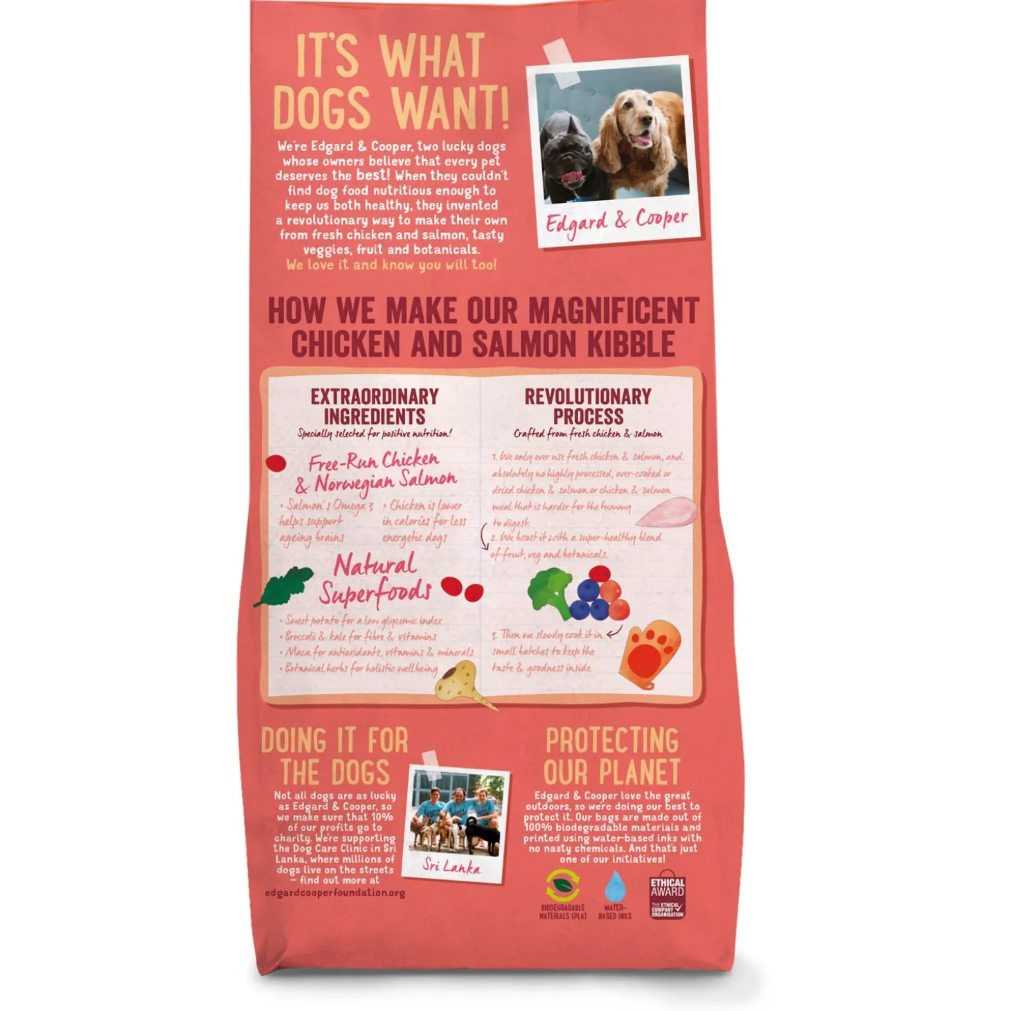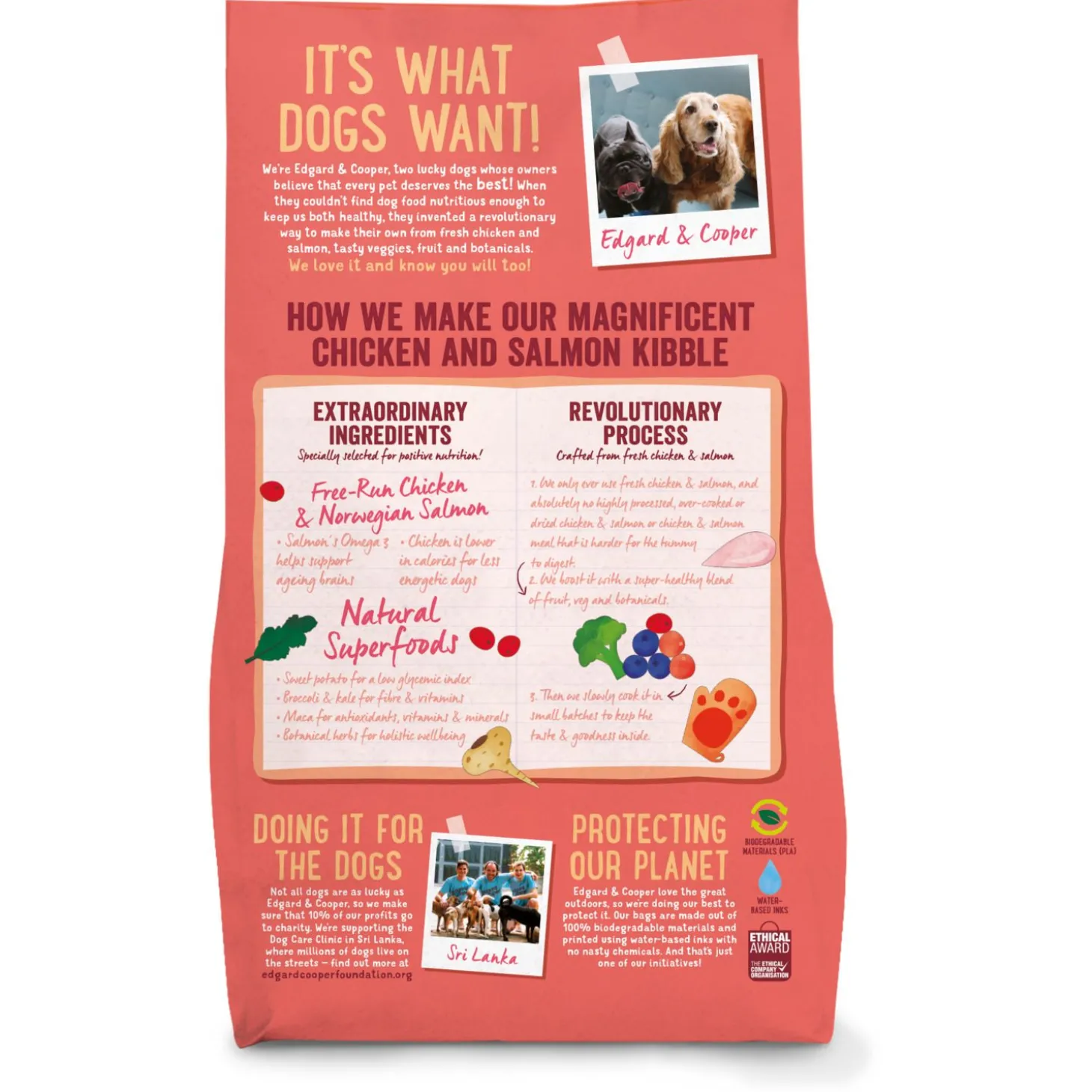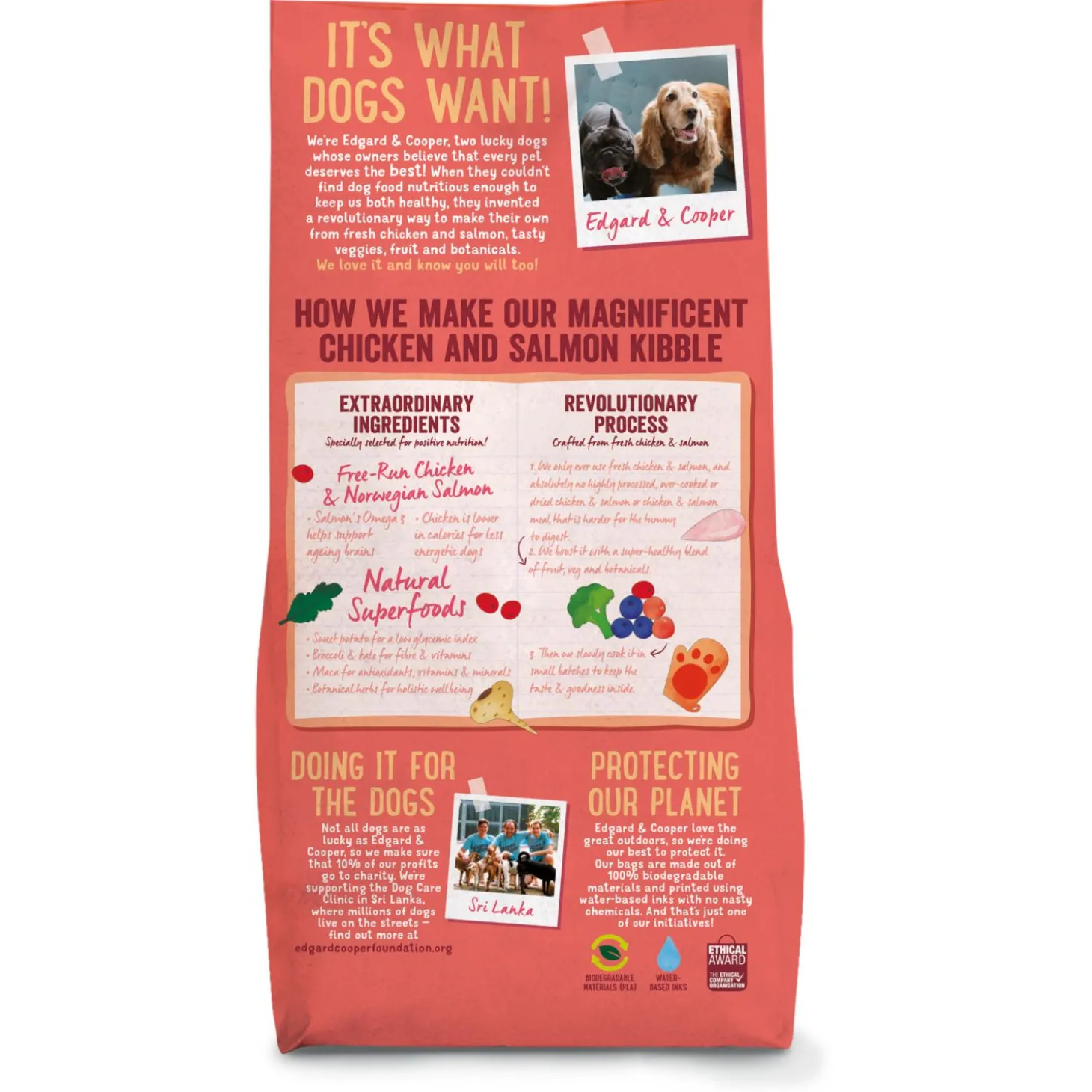 Edgard & Cooper vindt niet alleen gezonde huisdieren belangrijk, maar ook een gezonde planeet. De brokken zitten dan ook in een biologisch afbreekbare zak en daarnaast gaat 1% van de omzet naar een goed doel.