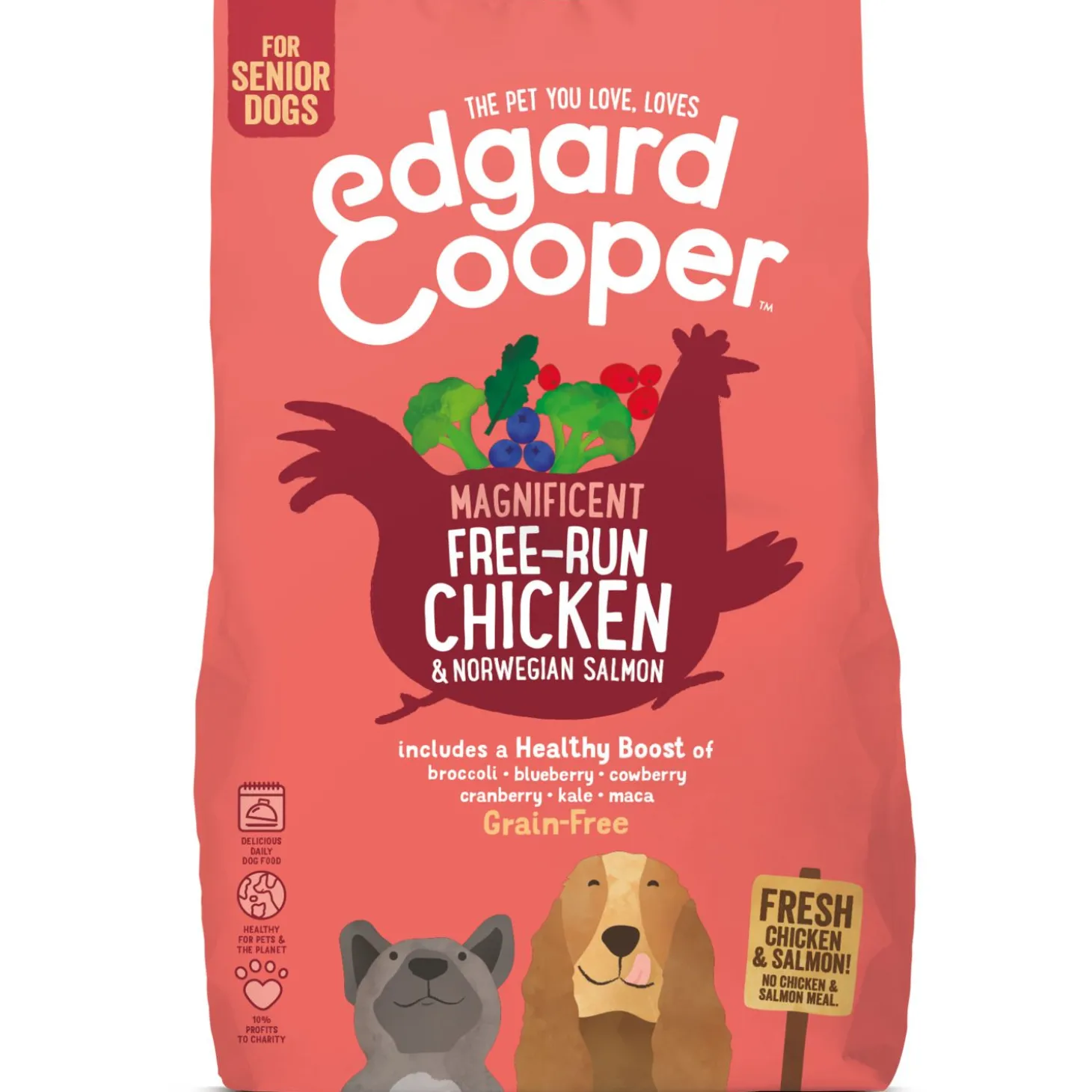 Goed eten is onmisbaar voor een sterk lichaam en een gezonde geest, dit kan je bereiken met een lekkere combinatie van vers vlees, groenten en fruit zoals Magnificent Free-Run Chicken & Norwegian Salmon van Edgard & Cooper voor oude honden.
