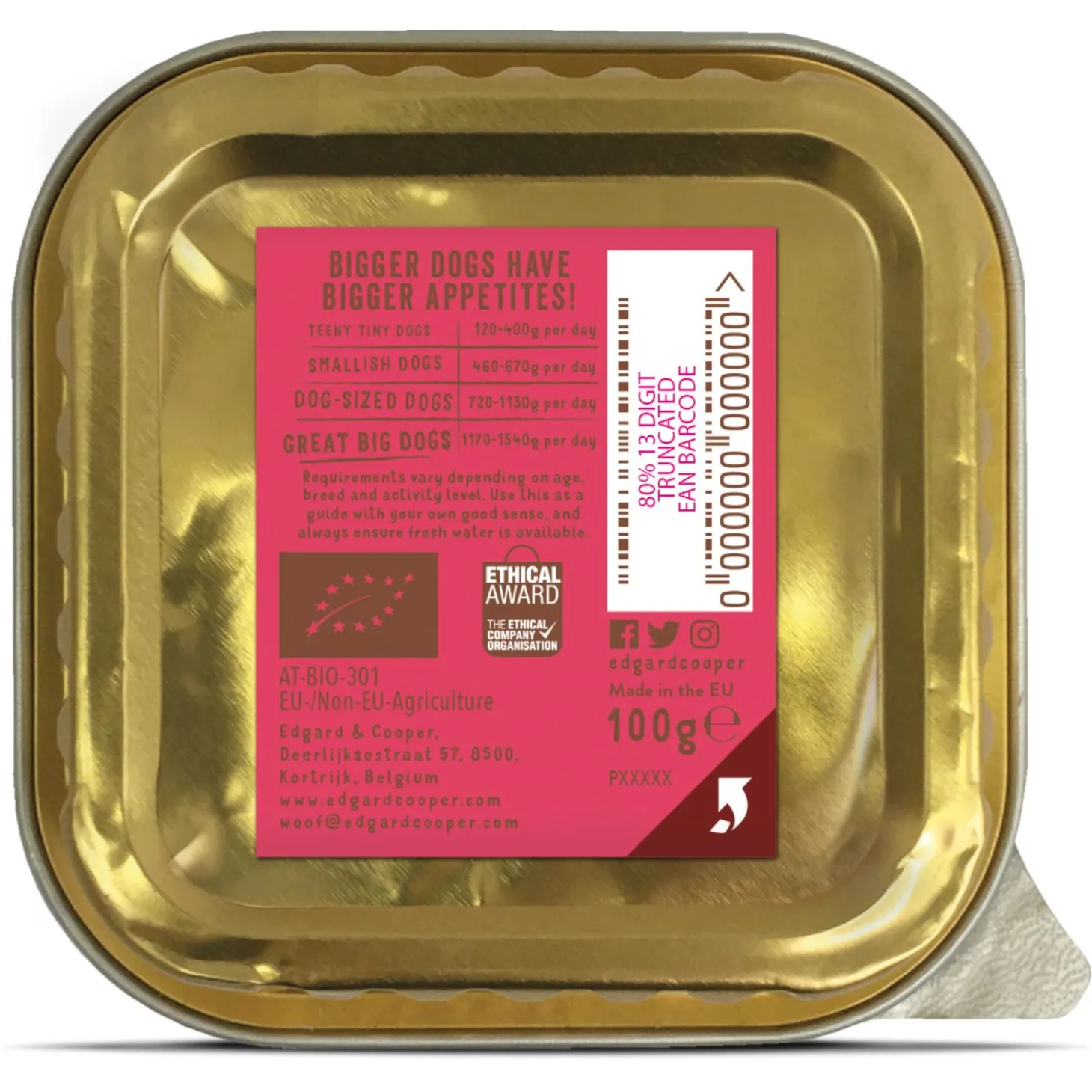 Edgard & Cooper vindt niet alleen gezonde huisdieren belangrijk, maar ook een gezonde planeet. De natvoeding zit dan ook in een recyclebaar kuipje en daarnaast gaat 1% van de omzet naar een goed doel.